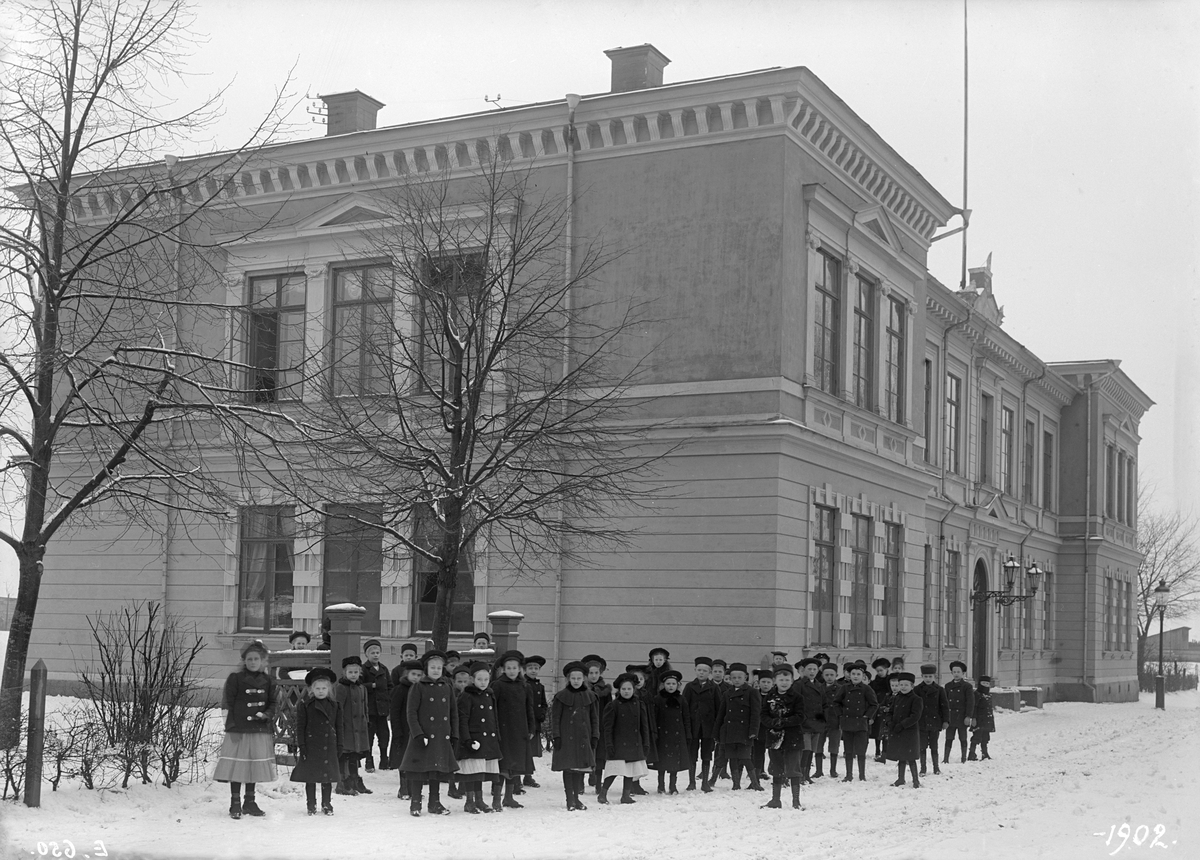 Vy mot Linköpings elementarläroverk för flickor en disig vinterdag 1902. Byggnaden uppfördes 1883 och löste då lokalfrågan för flickors högre utbildning i staden, som sedan 1867 var beslutad och från 1868 en realitet men tills nu varit husvill. För skolans ritningar stod den välrenommerade stockholmsarkitekten Axel Kumlien, som vid sidan av tio lärosalar skapade plats för gymnatik, bibliotek och bostad för skolans föreståndare samt rum för städerska. Skolan kom under 1940-talet ges nytt namn i Elsa Brändströms skola, själv elev på skolan vid tiden för bilden.