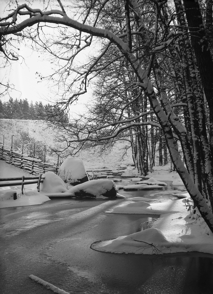 Tinnerbäcken i vinterskrud. Motiv som rimligtvis tagits som inspiration och förlaga för fotografens konstnärsskap som landskapsmålare. Den exakta platsen har inte lokaliserats.