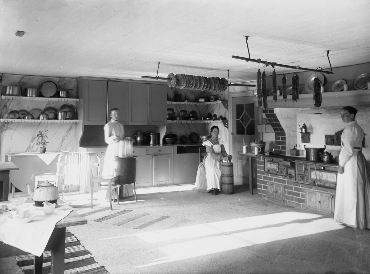 Interiör från köket till Valla gård omkring förra sekelskiftet. Om än något arrangerat stöps det ljus, kärnas smör och rörs i grytor vid den bastanta järnspisen. Vid tiden ägdes och beboddes gården av Linköpings stora välgörare inom främst kulturen, kapten Henric Westman. Sedermera kom han att skänka godset till Linköpings stad som av gåvan skapat Valla fritidsområde och plats för Valla folkhögskola.