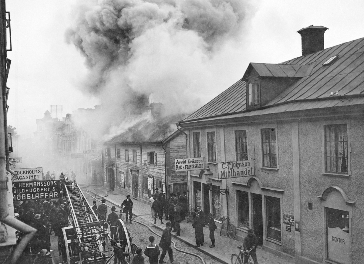 Dagen är den 3 oktober 1913. Några minuter efter klockan tre på eftermiddagen larmades brankåren i Linköping till en eldsvåda i den så kallade Bergdahlska gården på Storgatan 18. Då kåren kommit till platsen välde rök ut genom taket utefter husets hela längd, men endast i flygeln mot Snickaregatan hade elden brutit igenom taket. Som tur var det nära till brandposter och efter en kraftfull insats var branden under kontroll. Gården, som ägdes av disponent Hjalmar Larsson, var redan före branden fallfärdig och skulle rivas. Bostadslägenheterna på övervåningen var sedan endast ett par dagar lyckligtvis tömda och obebodda. I gatuplanet fanns ännu ett skomakeri och en plåtslagarverkstad. Man spekulerade om brandens orsak fanns att finna i verkstaden bristfälliga ässja eller kunde sökas i att gården en tid varit tillhåll för objudna gäster som möjligen hanterat eld oförsiktigt.