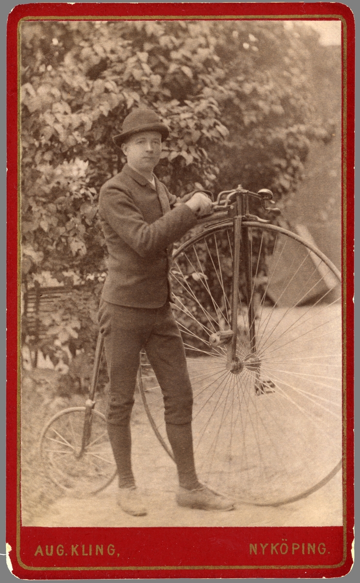 Porträtt av en stolt Hjalmar Ritzman invid sin järnhäst. Han var född i Linköping 1865 som son till muraren Anders Peter Ritzman och dennes hustru Anna Brita Andersdotter. I 20-årsåldern flyttade han med två äldre syskon till Nyköping. Hans liv tog honom vidare till Örebro som köpman.