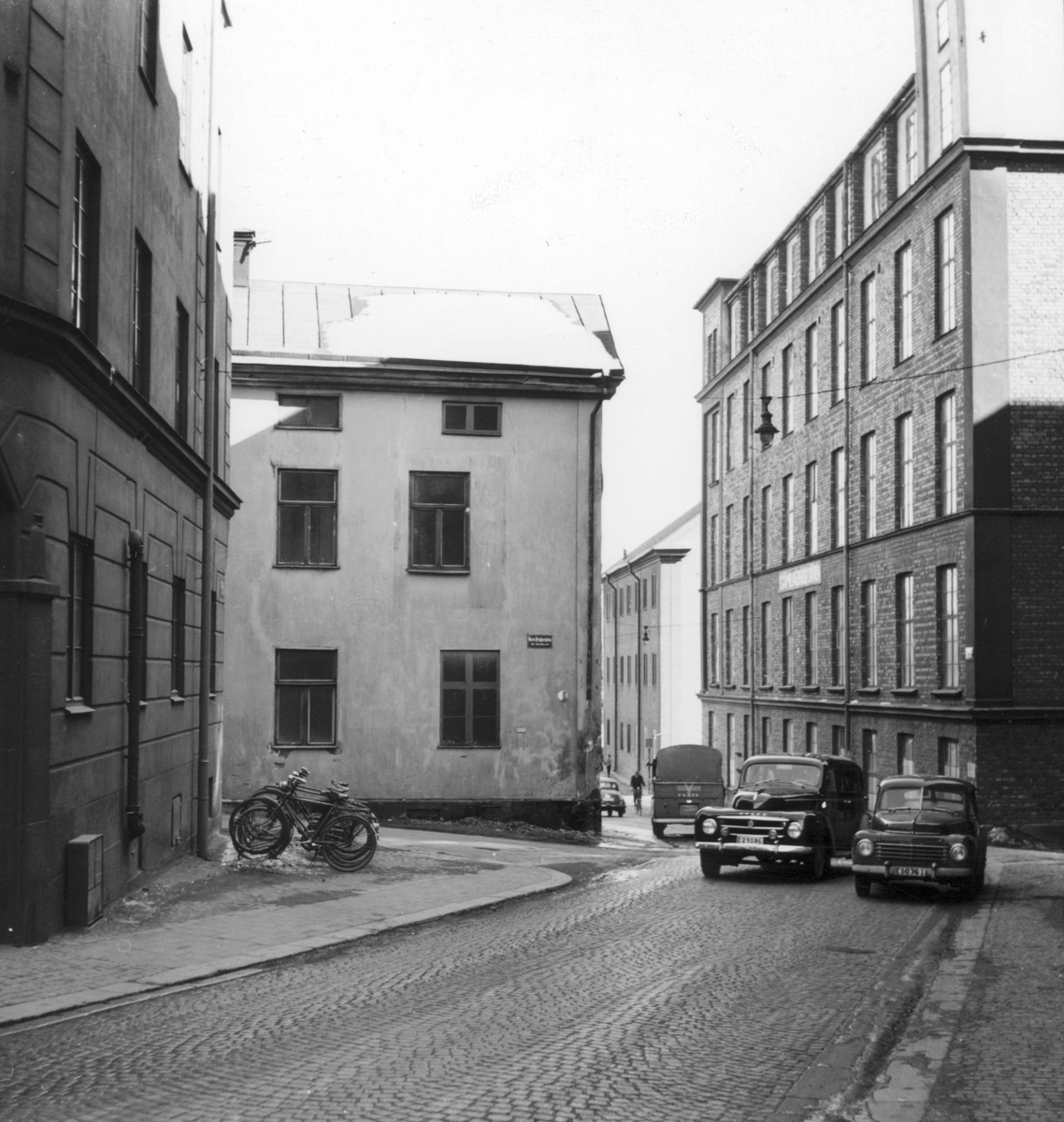 Parti av Västgötegatan ner mot Järnbron och Swartsiska huset. Byggnaderna på vänster sida ligger inom kvarteret Vårdtornet och fotografiet tas i samband med rivningsansökan. Byggnaderna revs då Västgötegatans nedre del skulle breddas i slutet av 1950-talet.