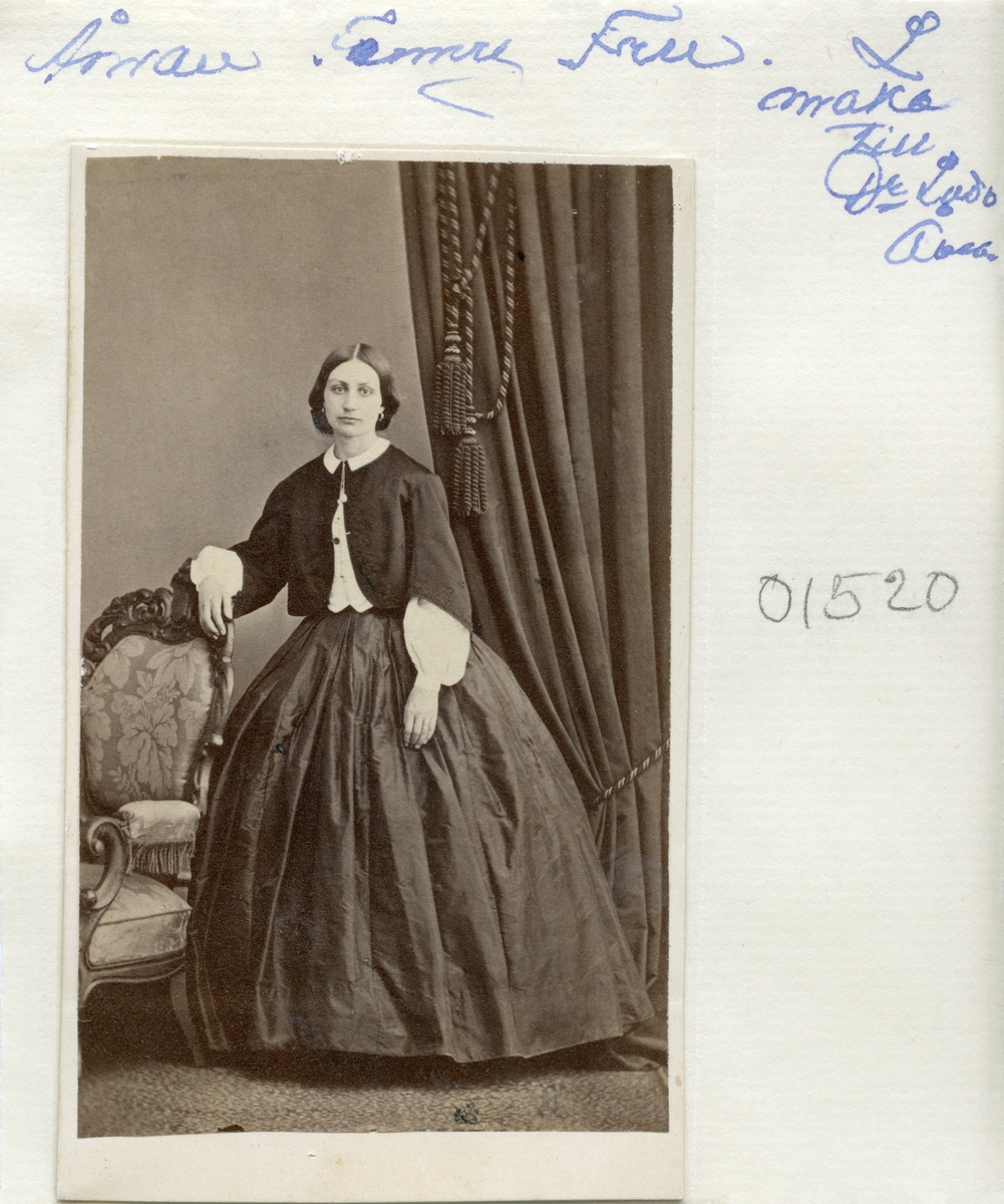 Porträtt av Fanny Åman, eller egentligen Fanny Nordvall, då hon enligt tidens namnskick behöll sitt flicknamn även som gift. Det påtalade äktenskapet hade inletts 1856 och gällde lasarettsläkaren Ludvig Åman. Vid tiden för bilden hade äktenskapet varat i omkring 10 år och parets två första barn var födda. Makarna skulle välsignas med ytterligare två under 1870-talet. Familjen var vid fototillfället och lång tid därefter bosatt i tjänstebostaden till länslasarettet i Linköping, där maken var verksam.