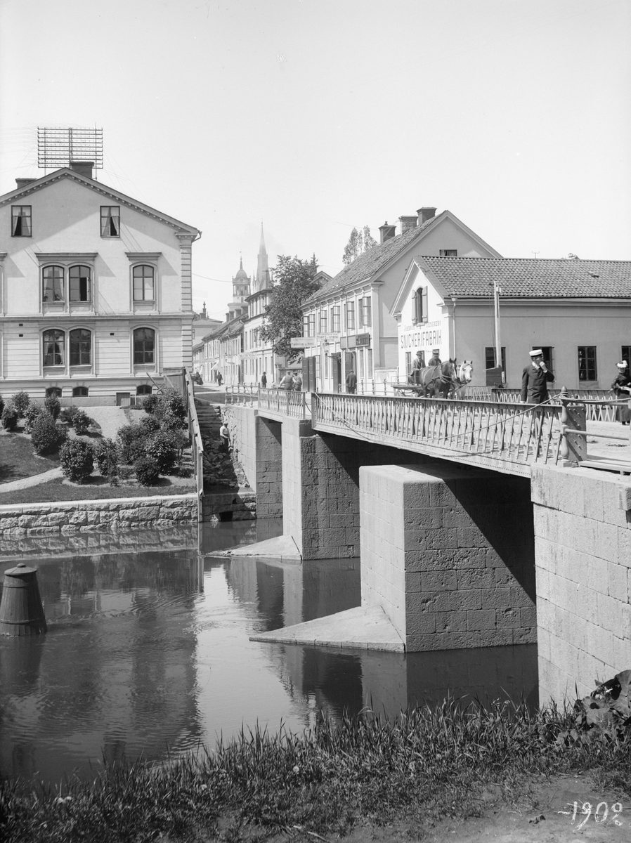 Stilla gatuliv utmed Storgatan och över Stångebro närmast betraktaren. Ett nedslag från sommaren 1902 där vi bland annat kan konstatera att en ny lasttrappa anlades mellan brospannet och fattighusets välordnade trädgård. I bakgrunden stadens bägge kyrkotorn, där S:t Lars ännu kröntes med sin äldre spira.