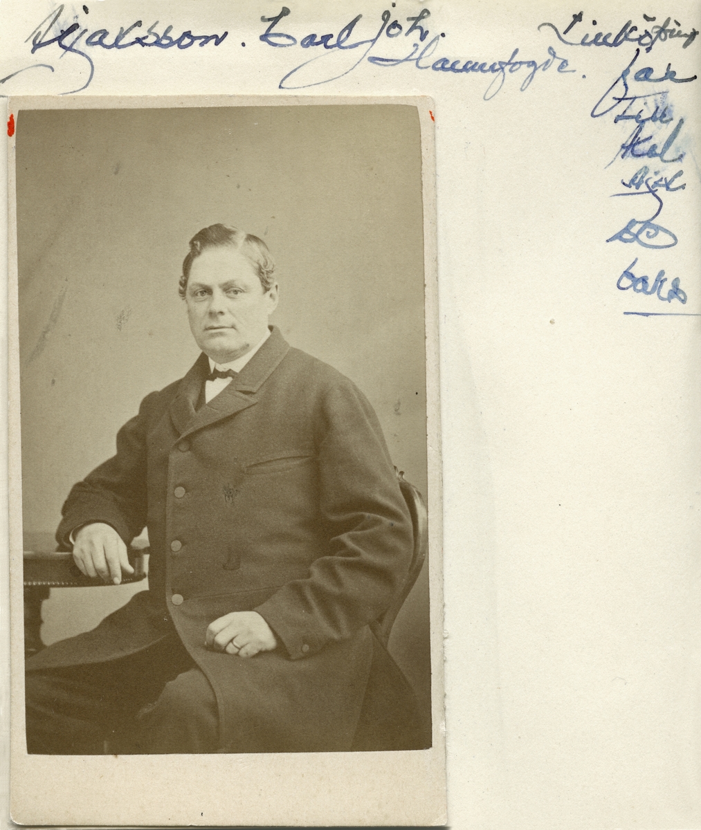 Porträtt av Carl Johan Ajaxson. Född i Västra Ny kom han att föra ett ambulerande liv. I sin ungdom tjänade han som betjänt vid greve Schwerins gods söder om Norrköping. Från 1845 var han vaktmästare vid Ljungstedtska skolan i Linköping, för att från 1848 bli källarmästare i Vikingstad. I mitten av 1850-talet bröt han upp för ny tillvaro i Vårdsberg. Efter ett tiotal år flyttade han åter till Linköping och innehade titlar som källarmästare, hamnfogde och handlare. Från 1873 är han istället knuten till Hallstad fabrik utanför Rimforsa. Hans sista hemvist blev i Västra Eneby där han från 1884 var hamnfogde vid lastageplatsen vid Hovby. Från 1846 var han gift med Anna Charlotta Sandberg.