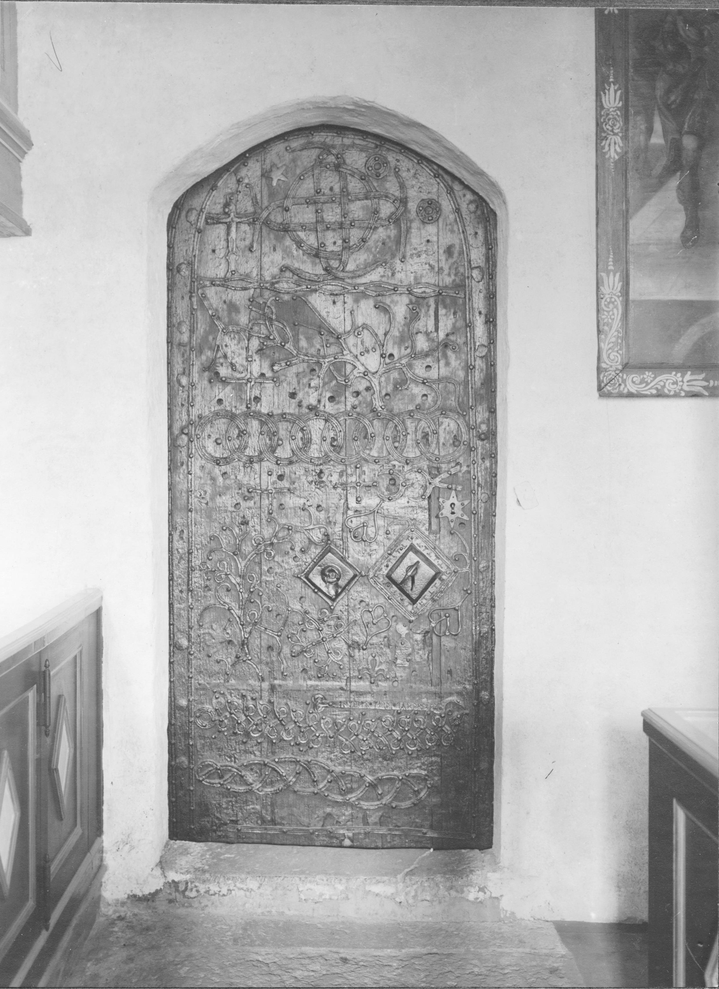 Sakristiedörren, järnbeslagen, 1100-tal, troligen tidigare i Ströja kyrka som ingångsdörr.