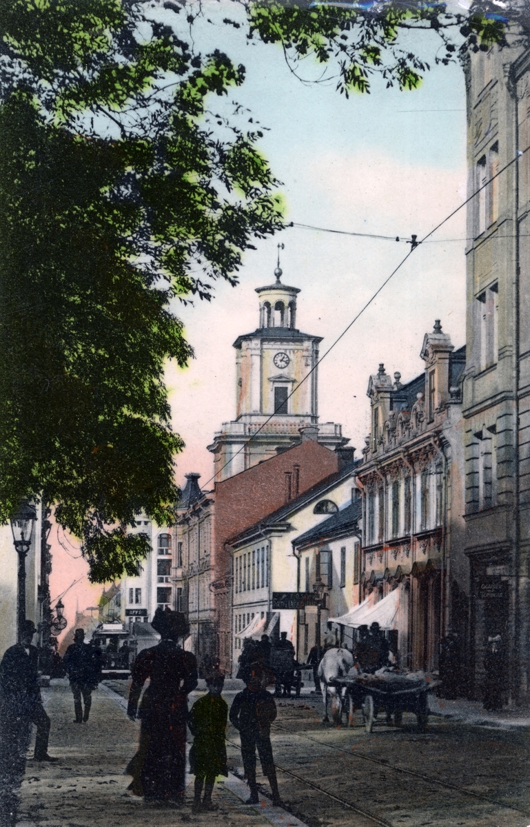 Folkvimmel utmed Drottninggatan i Norrköping genom ett kolorerat vykort från tiden då förra seklet var ungt. Som riktmärke för mer sentida betraktare reser sig Olai klocktorn i blickfånget.