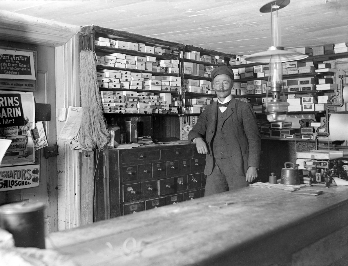 Handlare Carl Sundström i sin handelsbod, inrymd i Viby Källgård. Anslag och förpackningar förmedlar att han saluförde välkända varor som Pelegrins margarin, Göteborgskex och Liljeholmens stearinljus, men även galoscher från Viskafors och cigarrer från Forsells tobaksfabrik ingick tydligen i hans sortiment. På hyllorna ser vi bland annat etuier med knappar, resårsnören och skokräm. Carl Sundström drev sin handel i Viby under åren 1903-1908.