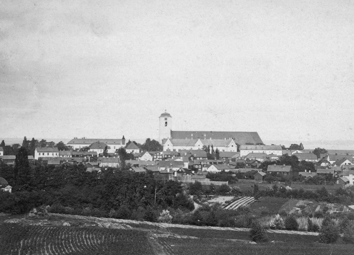 Vy mot Linköping sommaren 1864. Dominerande i bilden reser sig domkyrkan med sitt så kallade Hårlemanska torn som ersattes med nuvarande efter en omfattande ombyggnad från 1877. Framför kyrkan ses stadens läroverk, numera stadshus, som vid tiden var precis färdigställt. Övrig bebyggesle att nämna är slottet till vänster om kyrkan och det gamla gymnasiehuset till höger om läroverket. Den sistnämnda byggnaden fungerade från 1810 som logelokal för Linköpings frimurare.