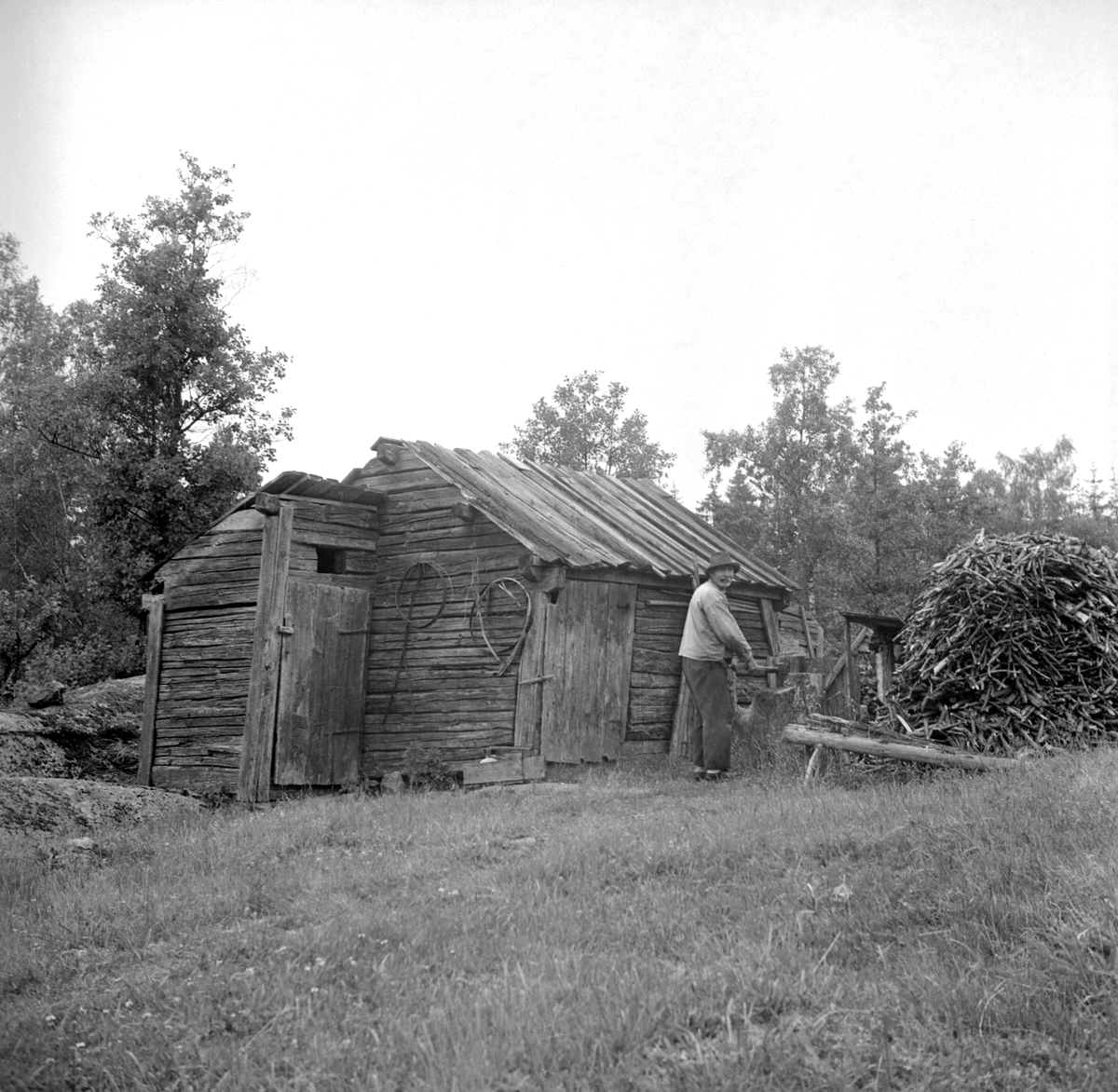 Sannolikt Oskar Gustafsson vid huggkubben till bostaden Norra Bråten söder om Ödeshög. På bild i samband med Östergötlands museums dokumentation av ålderdomlig bebyggelse i trakten.
