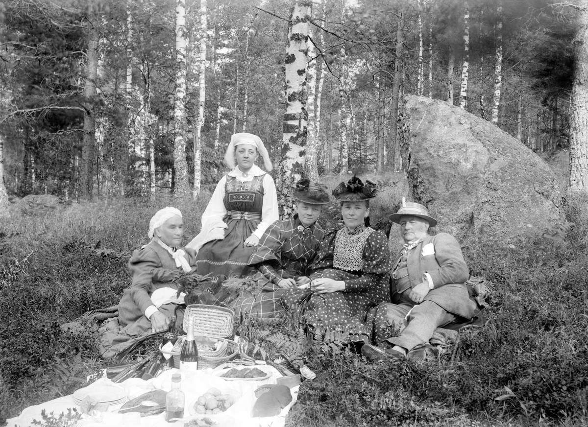 Utflykt i det gröna, sannolikt i trakten av Hägerstad slott i Hannäs. Antagandet kan göras utifrån de tre personer som identifierats. I kvinnan i mitten och mannen till höger ser vi Carolina Malmström och Ludvig Bäck. Från år 1880 var de ägare till Hägerstad slott, som de i huvudsak använde som sommarbostad. Den unga kvinnan iklädd folkdräkt är Dagmar Malm, blivande svärdotter till de beskrivna makarna.