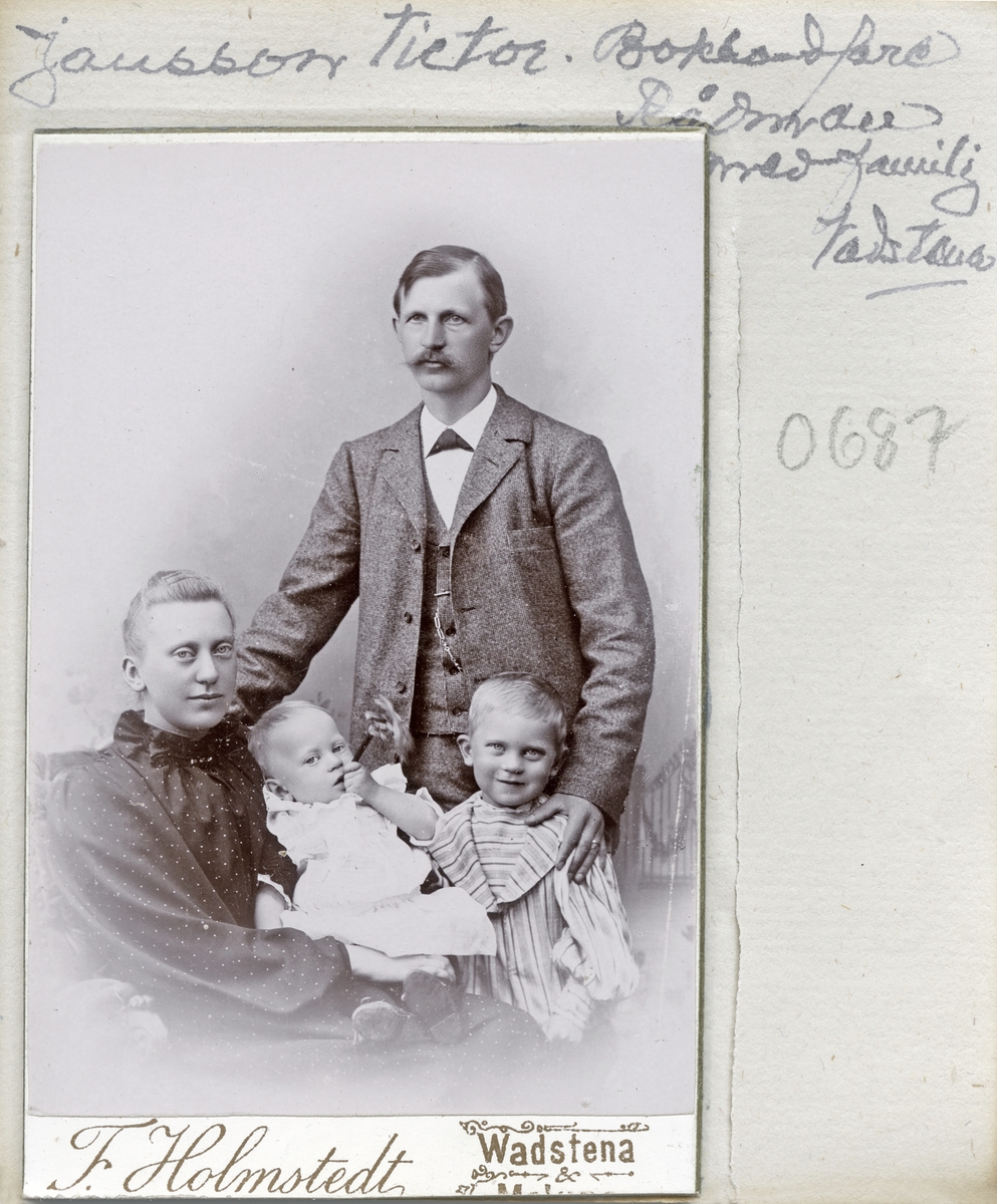 Bokhandlaren och rådmannen i Vadstena Victor Jansson med familj. Makan heter Olivia Larsson, född och uppvuxen i Vadstena. Maken har fört en mer ambulerande tillvaro som bokhandlare i så skilda orter som Arboga, Uppsala, Göteborg, Norrköping och Linköping. Till Vadstena hade han kommit 1886. Makarna gifte sig 1890 och sönerna på fotografiet, Ragnar Victor och Torsten Victor, är ett påfallande resultat av detta. Från 1903 kom parets barn att heta Wetterblad i efternamn.