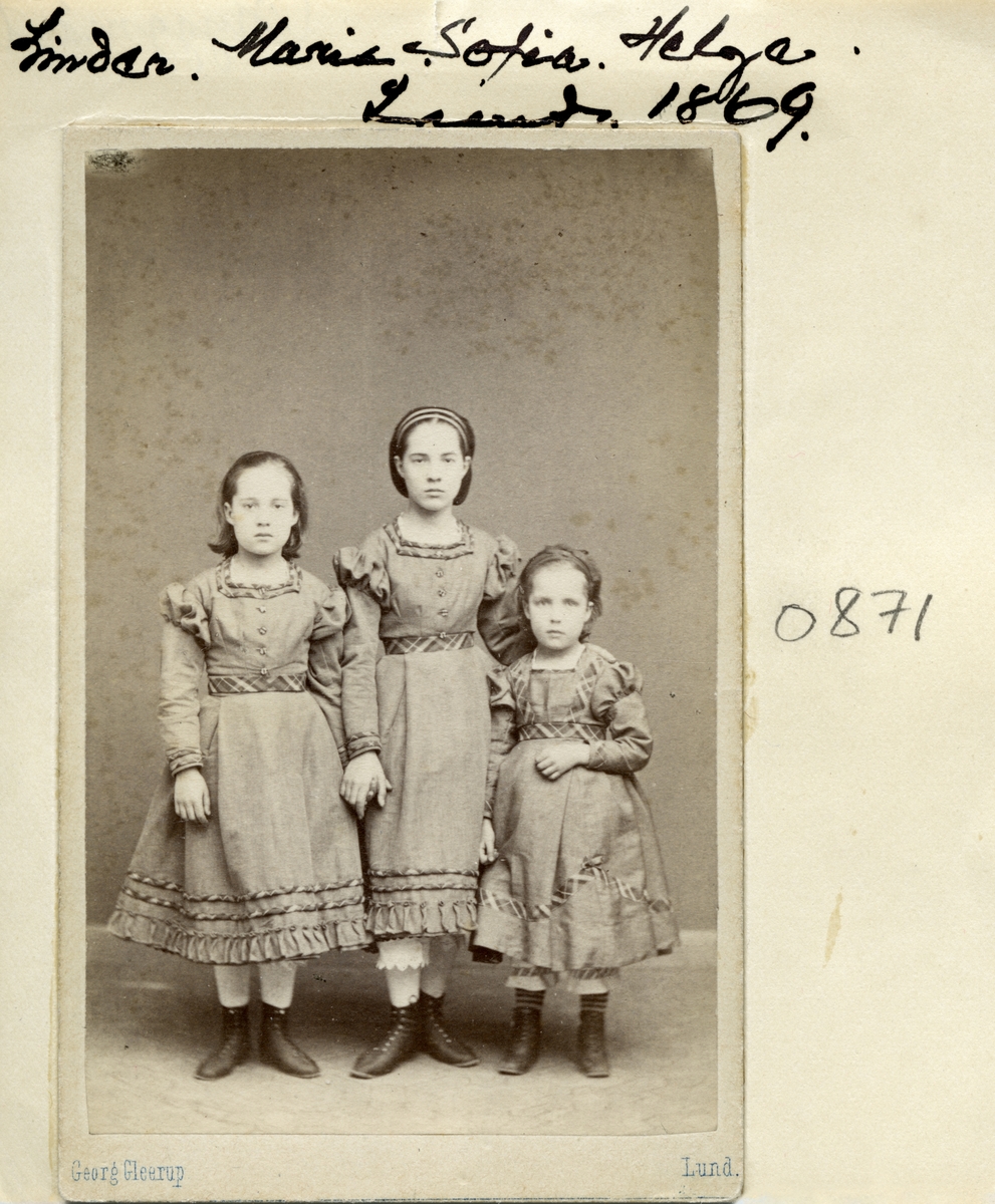 Systrarna Maria, Sofia och Helga står uppsträckta inför Georg Gleerups kamera. Flickorna är döttrar till professor Carl Vilhelm Linder och makan Ulrika Wallenberg. Fadern kom vidare att bli domprost i Linköping.
