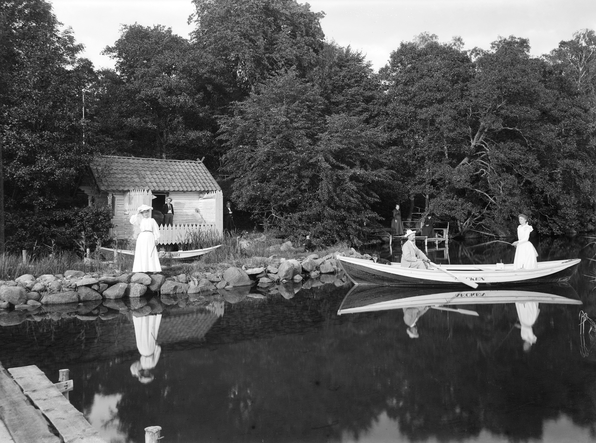 Motiv som tidigare gäckat oss. Vaga uppgift fanns om Olivehult och godsägare Nyström men inte begripliga nog för att med säkerhet placera platsen. Med hjälp av lokalhistoriskt orienterade har vi hamnat på Kristbergs rusthålls ägor, vars ägofigur ännu når sjön Boren. Gården ingick i det godsinnehav som den välkända byggmästaren Abraham Nyström och vidare hans söner byggt upp. Som rorsman i bilden sitter rimligtvis barnbarnet Georg Nyström, som vid tiden för bilden arrenderade rusthållet. Med sig i båten har han med motsvarande rimlighet sin hustru Tyra, född Ekstam. Den äldre kvinnan på bänken i bakgrunden svarar mot Georgs moster, den på gården inneboende Vilhelmine Möller.