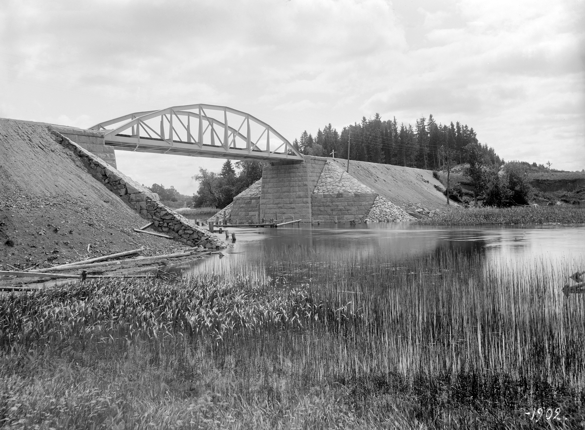 Östra centralbanan byggdes under åren 1898-1902 och genom sin dryga fem kilometer långa sträcka genom Landeryds socken mötte konsortiet ett hinder vid Stångån i höjd med Slattefors. Som lösning krävdes en 30 meter lång järnvägsbro med sju meters segelhöjd. Vid tiden för bilden var bron precis färdigställd, om än med undantag av nödvändiga stenarbeten.