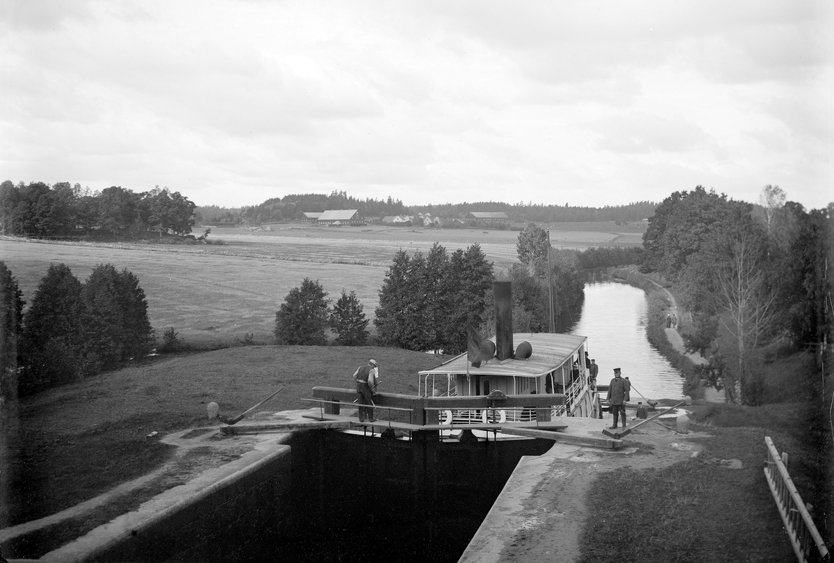 Passagerarfartyget Nya Kinda har gått in i Hovetorps sluss på sin färd söderut på Kinda kanal.