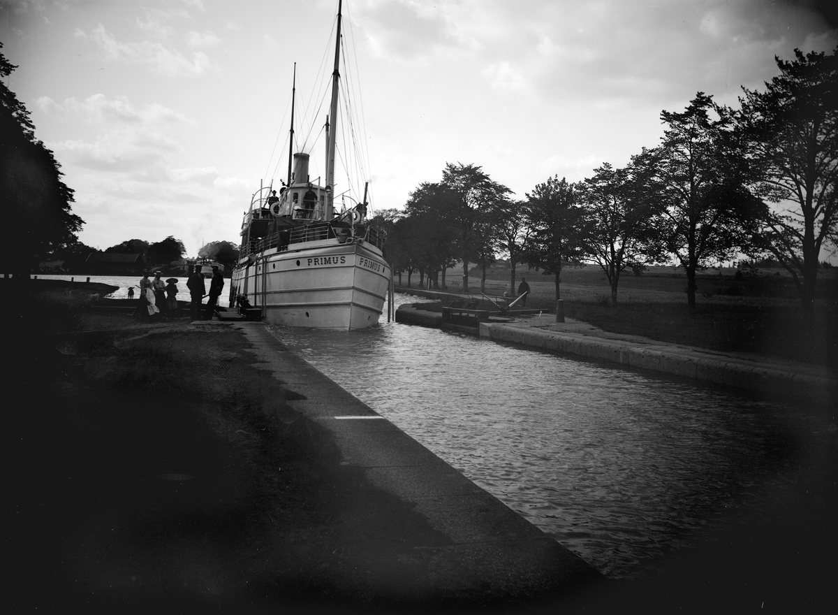 Motsolsljuset eller kvällskymningen har gett oss detta mörka men märkvärdiga ögonblick från Bergs slussar. Mot Karl Johans-slussens högst belägna bassäng stävar passagerarångfartyget Primus. Hon var byggd vid Motala Verkstad 1876 för traden Stockholm-Jönköping med Motala som hemmahamn.