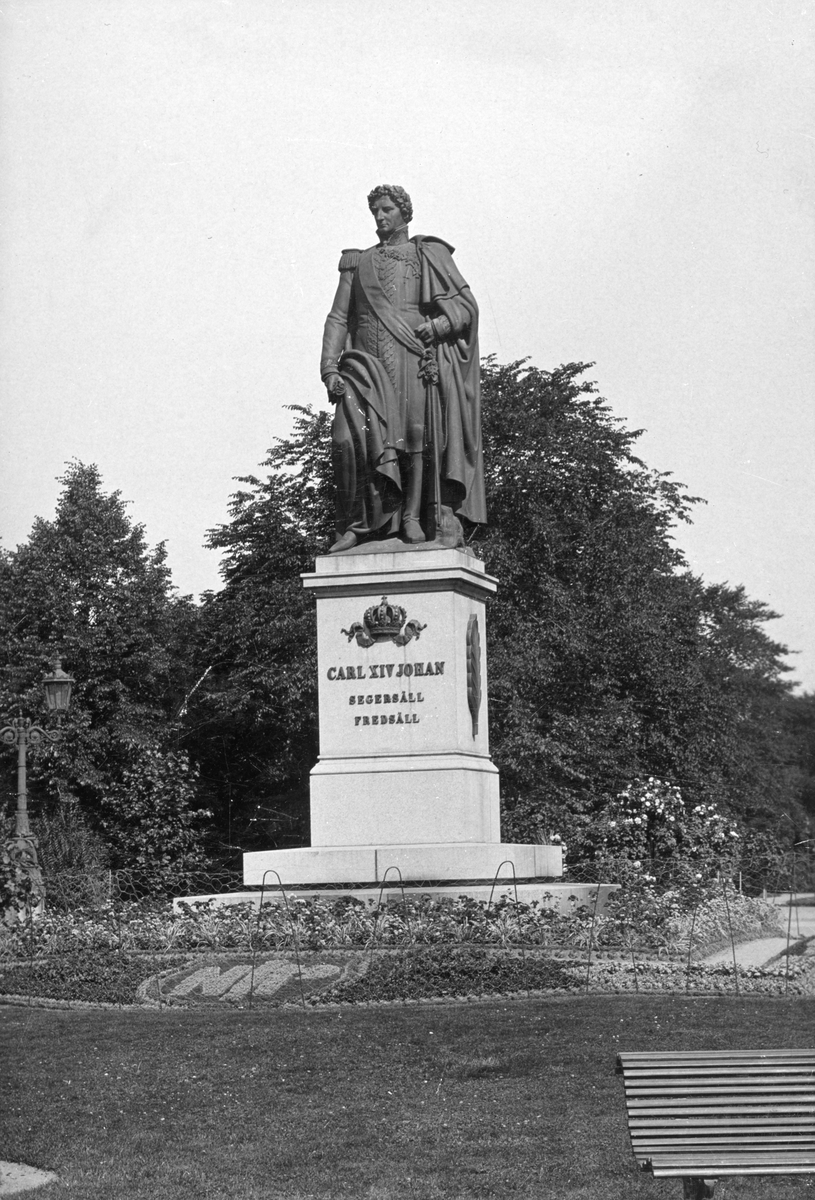 Carl XIV Johans staty av Ludwig von Schwanthaler i Carl Johans park i Norrköping. Avtäckt 20 oktober 1846. Här dokumenterad omkring förra sekelskiftet.