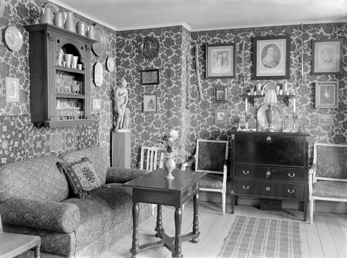 Inblick i konstnären och fotografen Didrik von Essens hem. Inget i den odaterade interiören ger något direkt stöd från vilken av von Essens många bostäder i Linköping bilden är hämtad. Ett gott antagande är dock dåvarande Barnhemsgatan 5 (Rosendal 2) som var hans hem under åren 1893-1903.