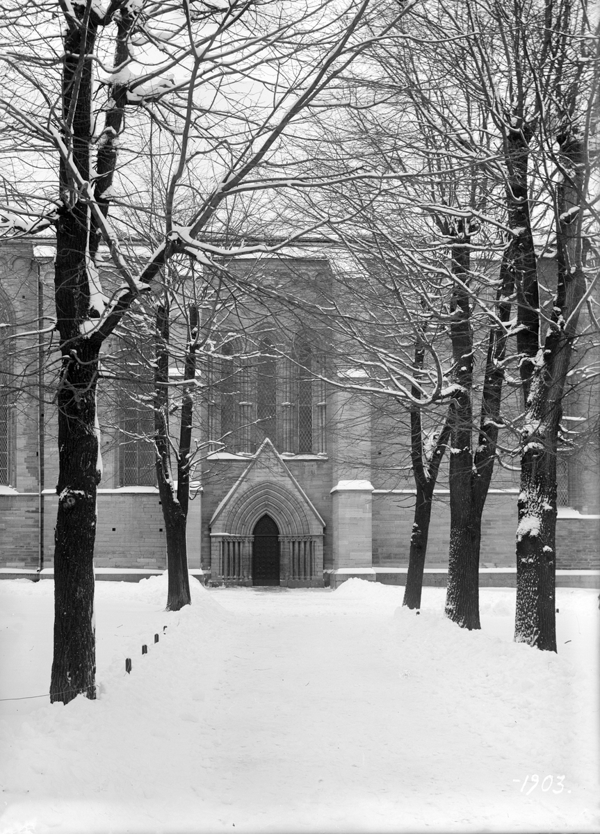Miljön vid Linköpings domkyrka en vinterdag 1903. I blickfånget kyrkans så kallade södra tvärskeppsportal.