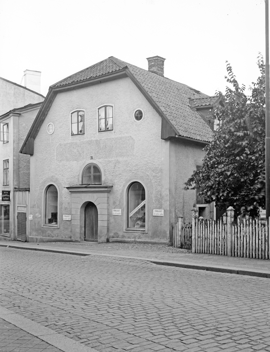 Vy mot Stenhusgården i Linköping. Ett medeltida stenhus vars ålder bland annat tillkännages genom byggnadens sneda läge mot den under 1600-talet upprätade Storgatan.