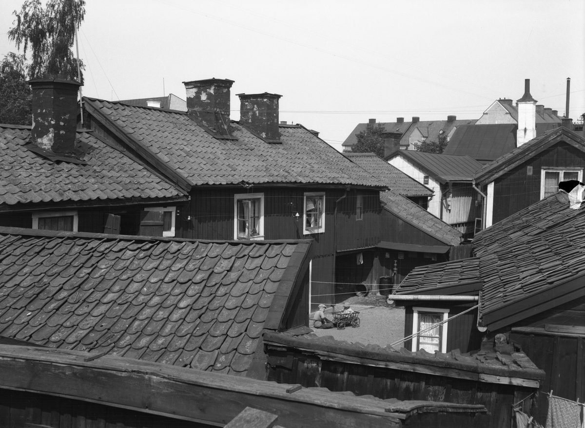 Linköping 1929, ännu till stora delar i tråkåkarnas tid. Miljöerna bjöd på en rad konsekvenser, en av de goda var i bästa fall trygga fristäder för barnen. Här gårdsbildning i hörnet av Hunnebergsgatan och Östgötagatan.