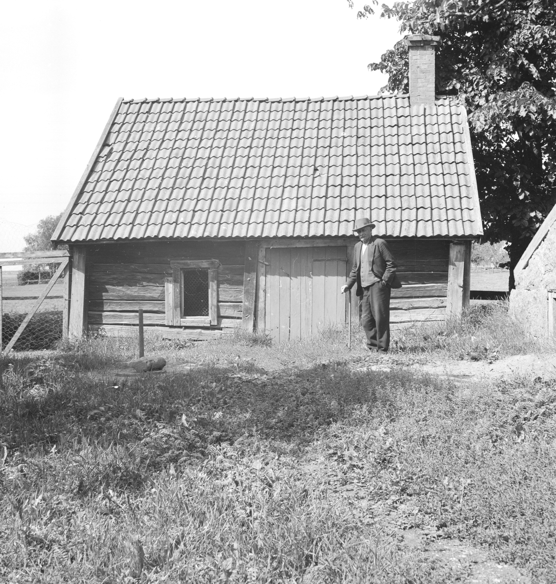 Motiv från Egeby källgård i Västerlösa. Dokumentation av Östergötlands museum 1940. Mannen är gårdens ägare vid tiden, Hjalmar Andersson.
