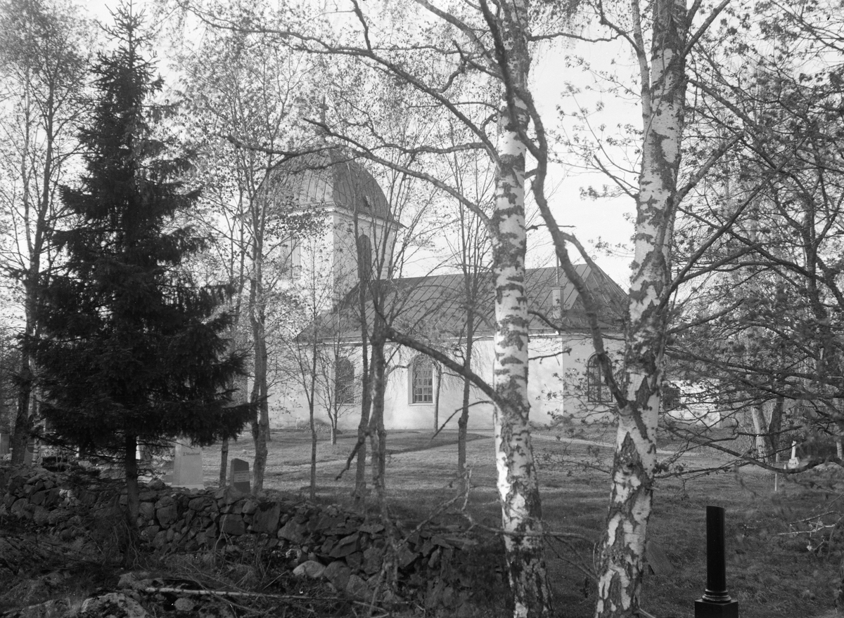 Kvarsebo kyrka genom spirande grönska våren 1921.