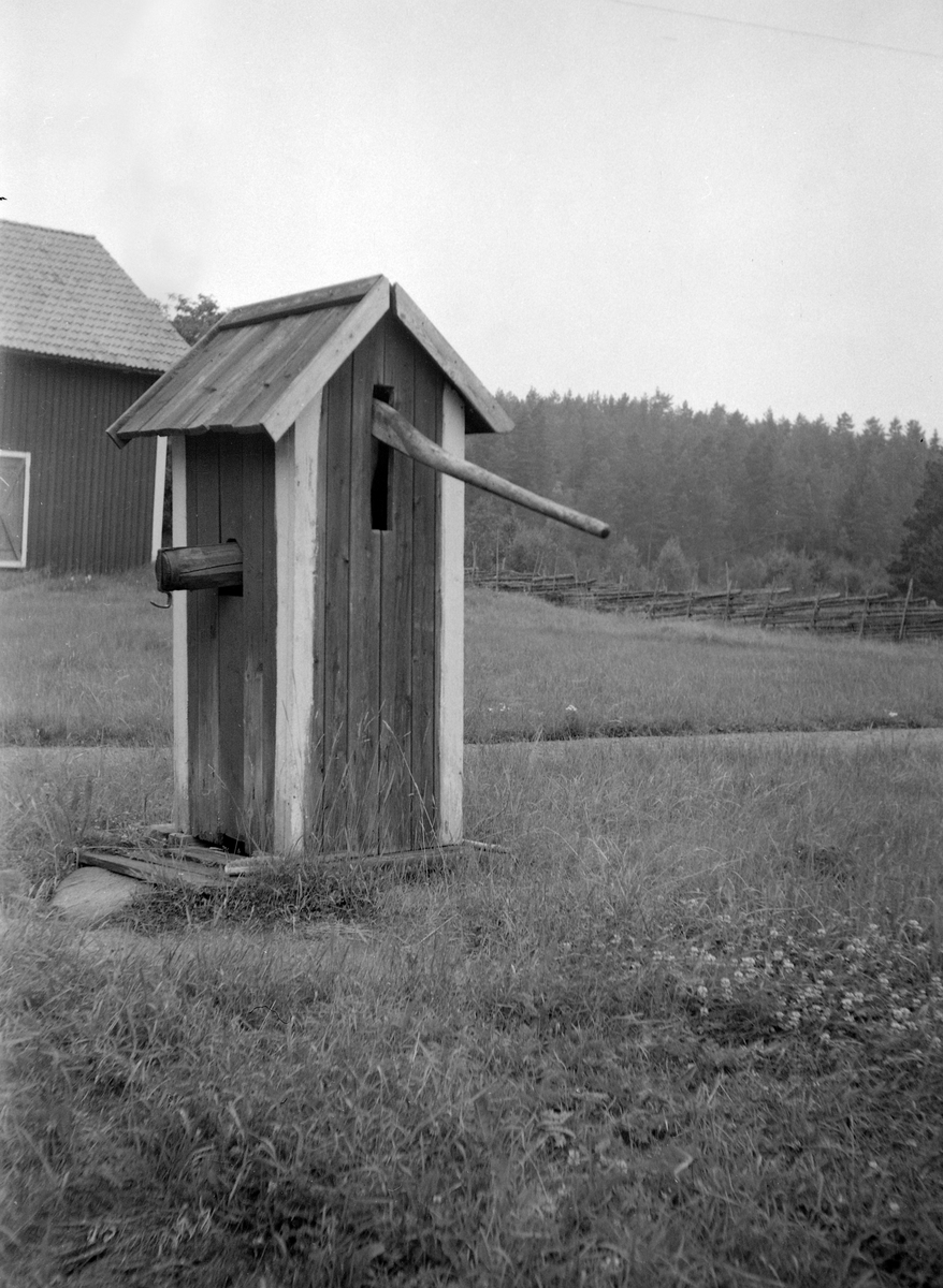 Inbyggd gårdspump av trä på gården Kuvehult Lillgård. Bild från Östergötlands museums dokumentation av äldre allmogebebyggelse i Horn socken 1953.