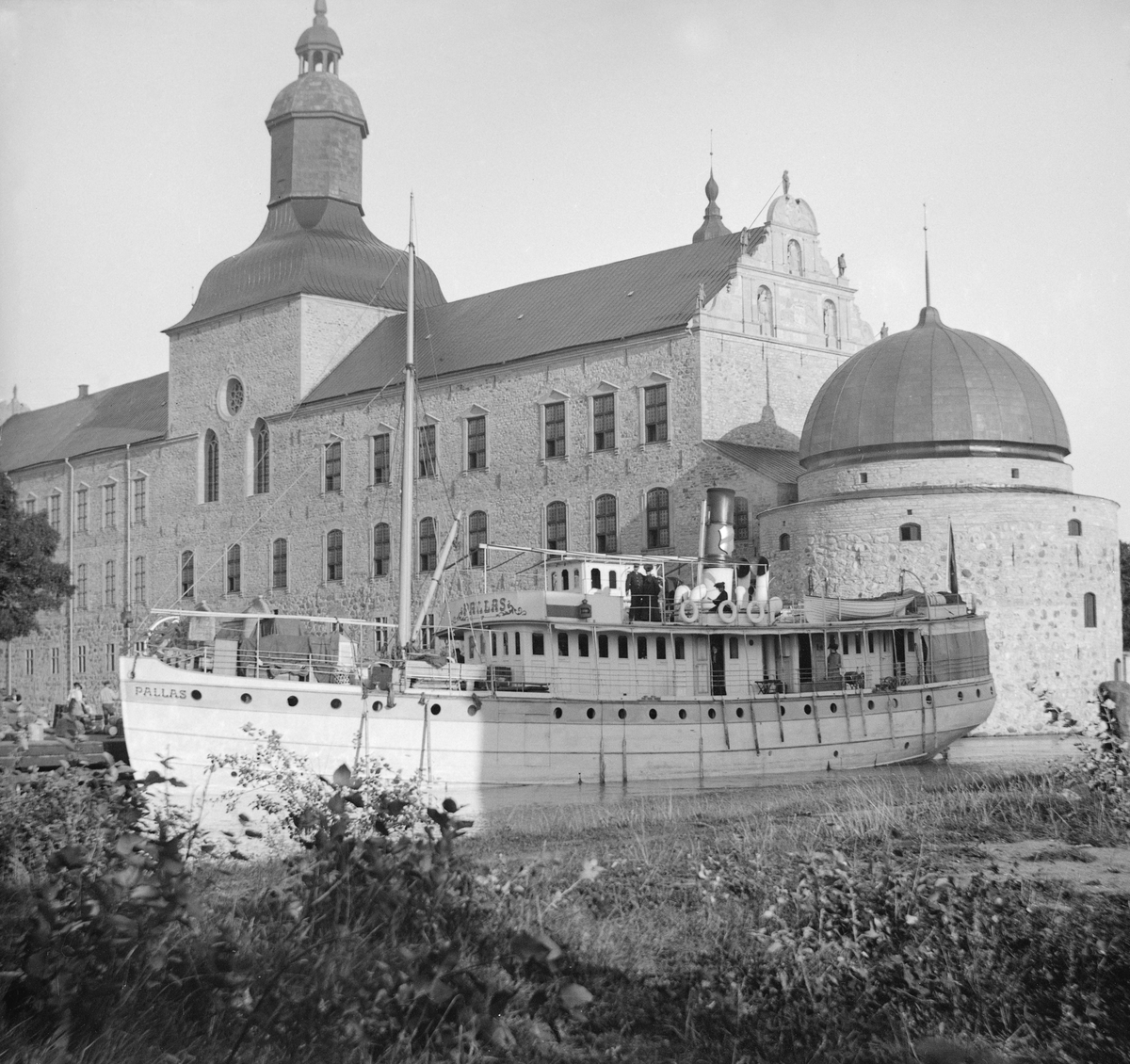 Ångfartyget Pallas i kaj invid Vadstena slott. Fartyget var leveraret 1885 från Motala Verkstad och tjänade främst som så kallat expressfartyg för emigranter med Göteborg som destination för vidare färd mot Amerika.