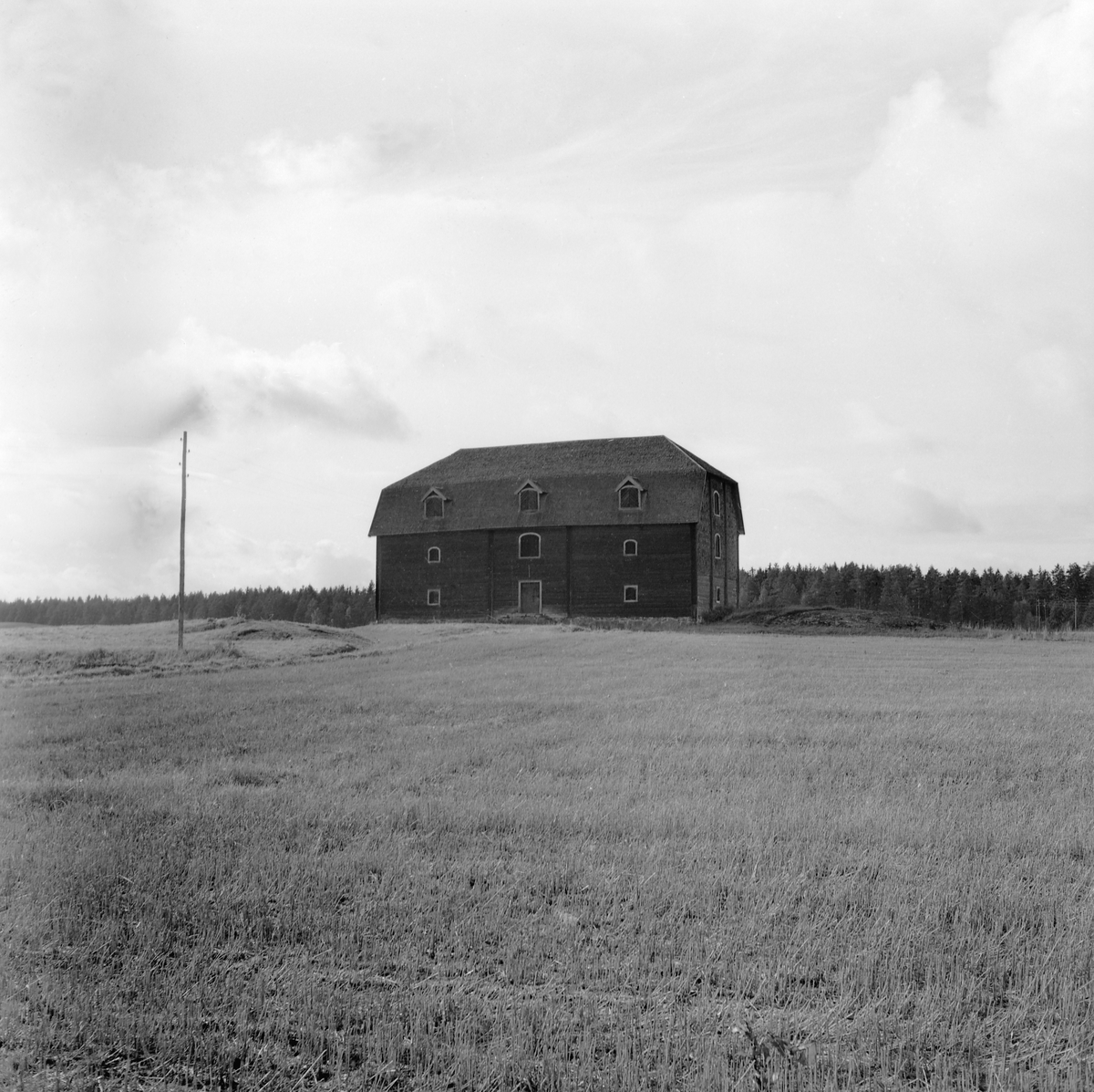 Vy över ägorna till Ryds herrgård med godsets sädesmagasin i fonden. Året är 1963 och platsen kommer inom kort att fullständigt omdanas. Här planerar staden för den nya stadsdelen Ryd med plats för cirka 10 000 invånare. Magasinet får från 1972 ny funktion som stadsdelskyrka under namnet Mikaelskyrkan.