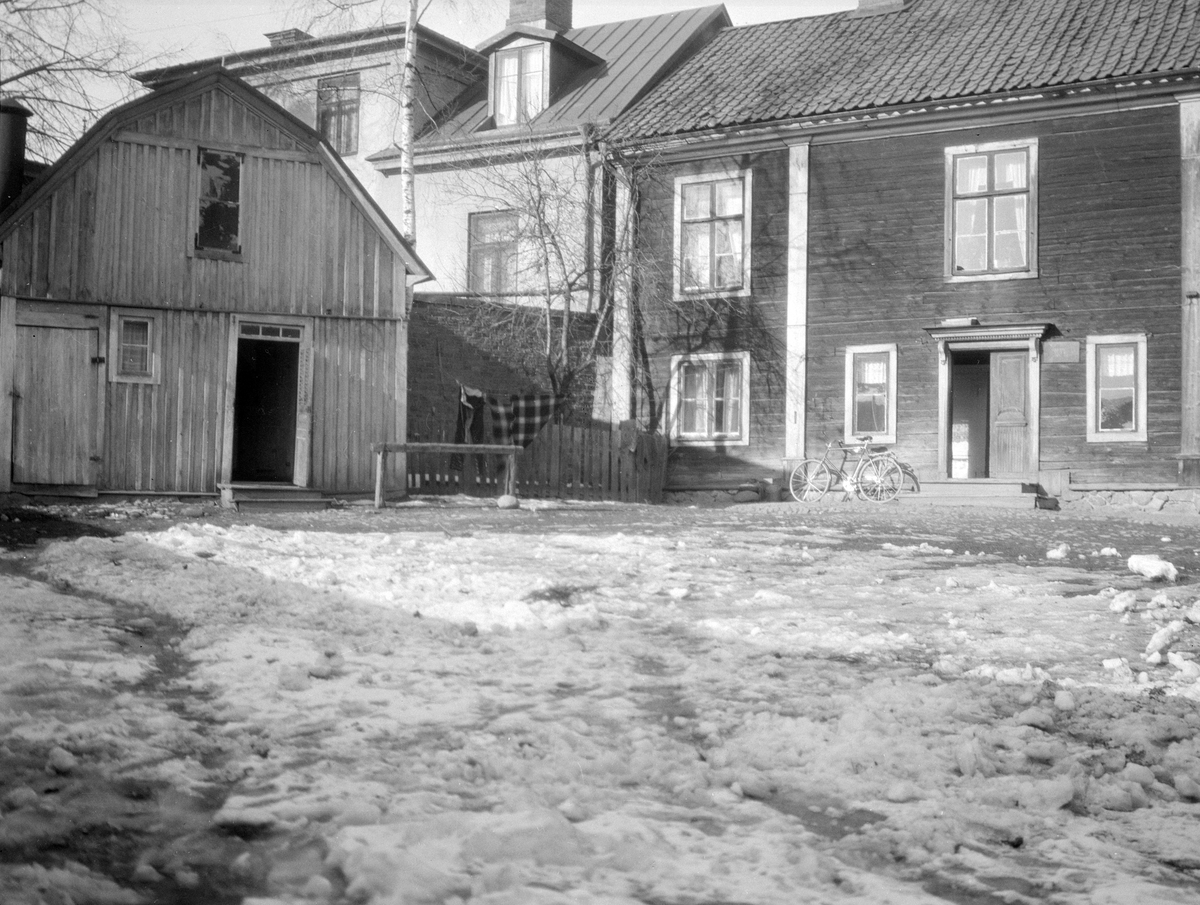 Gårdsinteriör från Nygatan 32 i Linköping 1930. I tid kort före rivningen av gårdens hus för ny markanvändning. Vy mot nordväst.