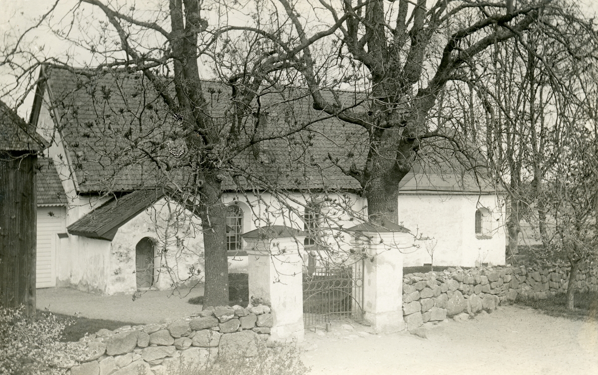 Östra Skrukeby kyrka dokumenterad före restaurering 1925-26. Längst till vänster skymtar det vapenhus i trä som tillkom efter tornets nödvändiga nedrivning 1868. Därefter ses det gamla vapenhuset och till höger det gravkor som tillkom på 1600-talet för släkten Ribbing.