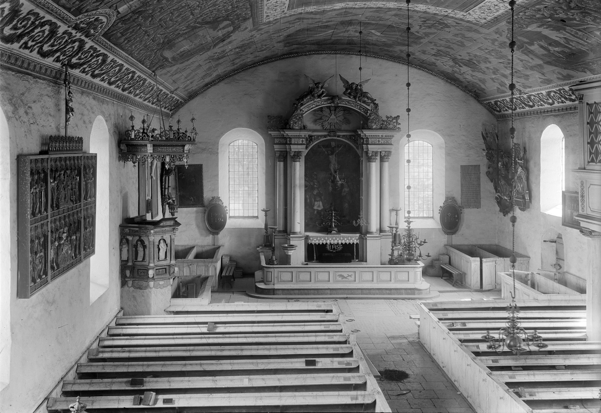 Interiör av Vist kyrka 1904. I det närmaste allt bilden visar kom olyckligtvis att bokstavligen gå upp i rök vid en eldsvåda 1961. Bland klenoderna under det vackert bemålade taket ses närmast till vänster det senmedeltida altarskåp som enligt uppgift var ett verk av Bendt Notke eller någon av dennes elever. Den unika predikstolen, den enda i landet som sannolikt kunnat knytas till bildhuggaren Börje Eriksson, var utförd 1650 och av samma mästare emanerar dopfunten, som lyckligtvis var en av få inventarier som kunde räddas ur lågorna. Av det förlorade stannar denna redogörelse vid altartavlan som föreställde korsfästelsen och var utförd av konstnären Johan Jerling.