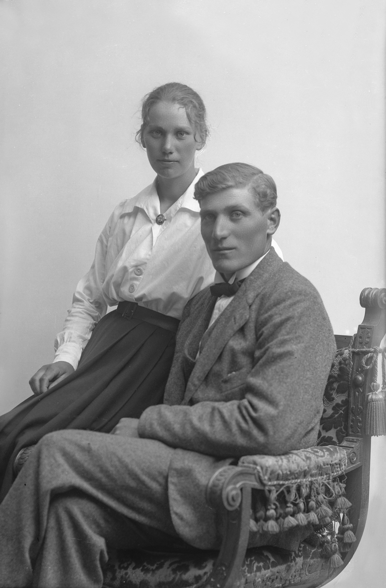 Porträtt från fotografen Maria Teschs ateljé i Linköping. 1910-tal, ev. 1912. Beställare: Axel Anderson. "Ö. gård Björsäter" Man och kvinna, ett par.
