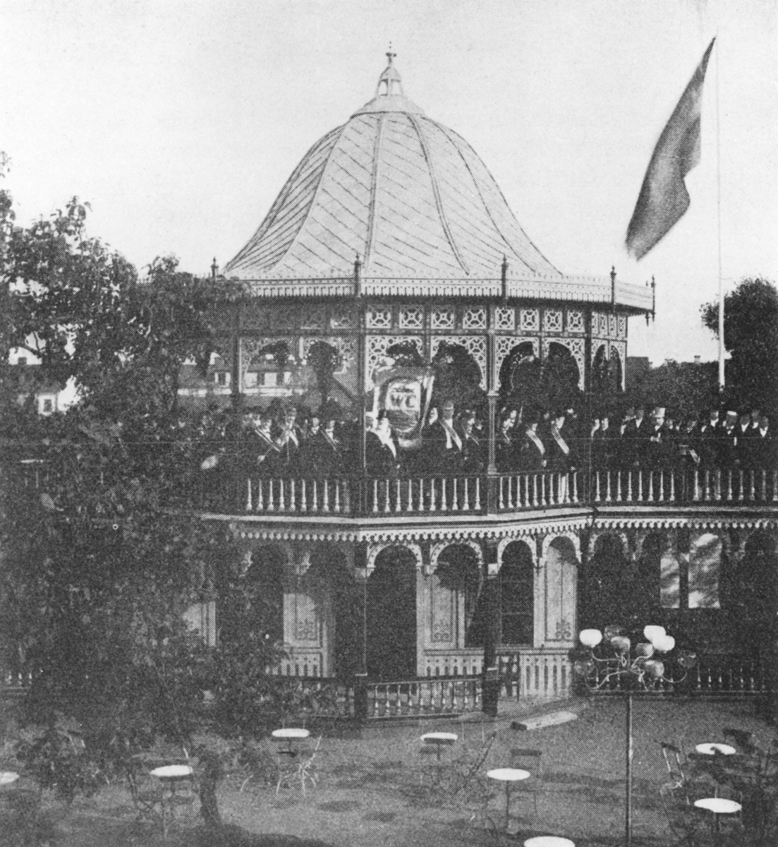 Bilden visar ett repro av ett medfaret men unikt motiv från den så kallade Wernerska trädgården i Linköping. Tiden är första delen av 1880-talet. Den skarpsynte kan på standaret utläsa att det rör sig om det parodiskt ordensliknande sällskapet Wiknings-Commissionen, som under en period höll årliga sommarfester i trädgården.