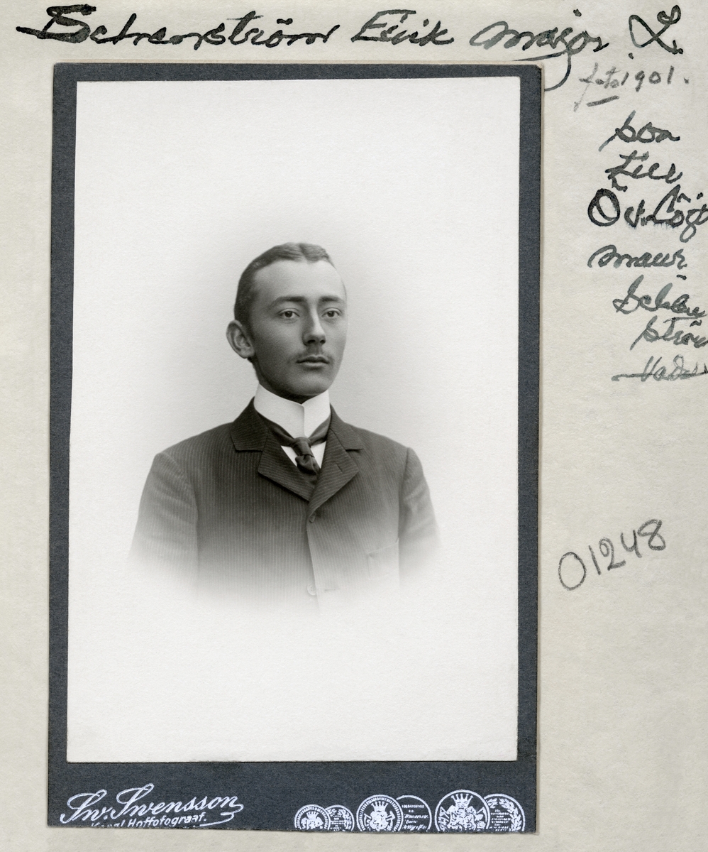 Porträtt av major Erik Gabriel Schenström. Född den 7 juli 1882 i hemmet Grankulla, Flistad socken som son till löjtnant Mauritz Gabriel Schenström och Helena Swebilius. Gift i oktober 1908 med Kjerstin Margareta Schnell med vilken han fick tre döttrar. Han avled den 2 november 1933 i hemmet Solbacken, Ålberga i Södermanlands län.