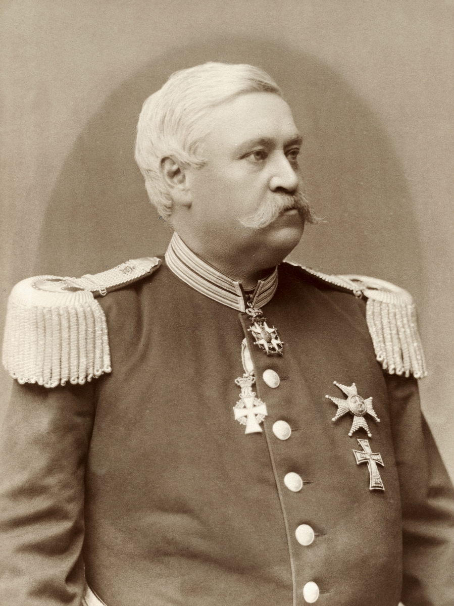 Porträtt av Gustaf Harald Spens. Född 1827 på Grensholm i Vånga socken, Östergötland. I vuxen ålder gjorde han en lång militär karriär vid Andra livgrenadjärregementet i Linköping. Från sergeant år 1844 till överste och regementschef från år 1871. Även generalmajor vid armén från 1886. Efter sitt militära avsked 1888 utsedd till landshövding i Kronobergs län. I sitt privata liv var han från 1851 gift med sin kusin Ebba Eleonora von Seth.