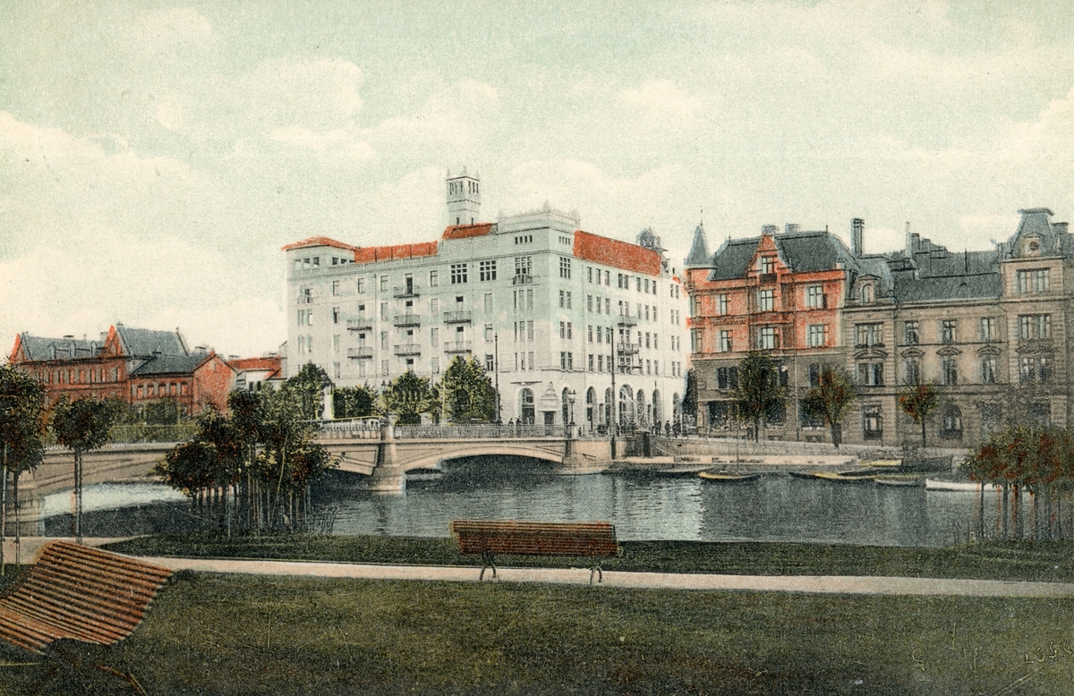 Vy över Motala ström mot husfasaderna utmed Hamngatan i Norrköping. I blickfånget Hotell Göta. Kolorerat brevkort postgånget 1907.
