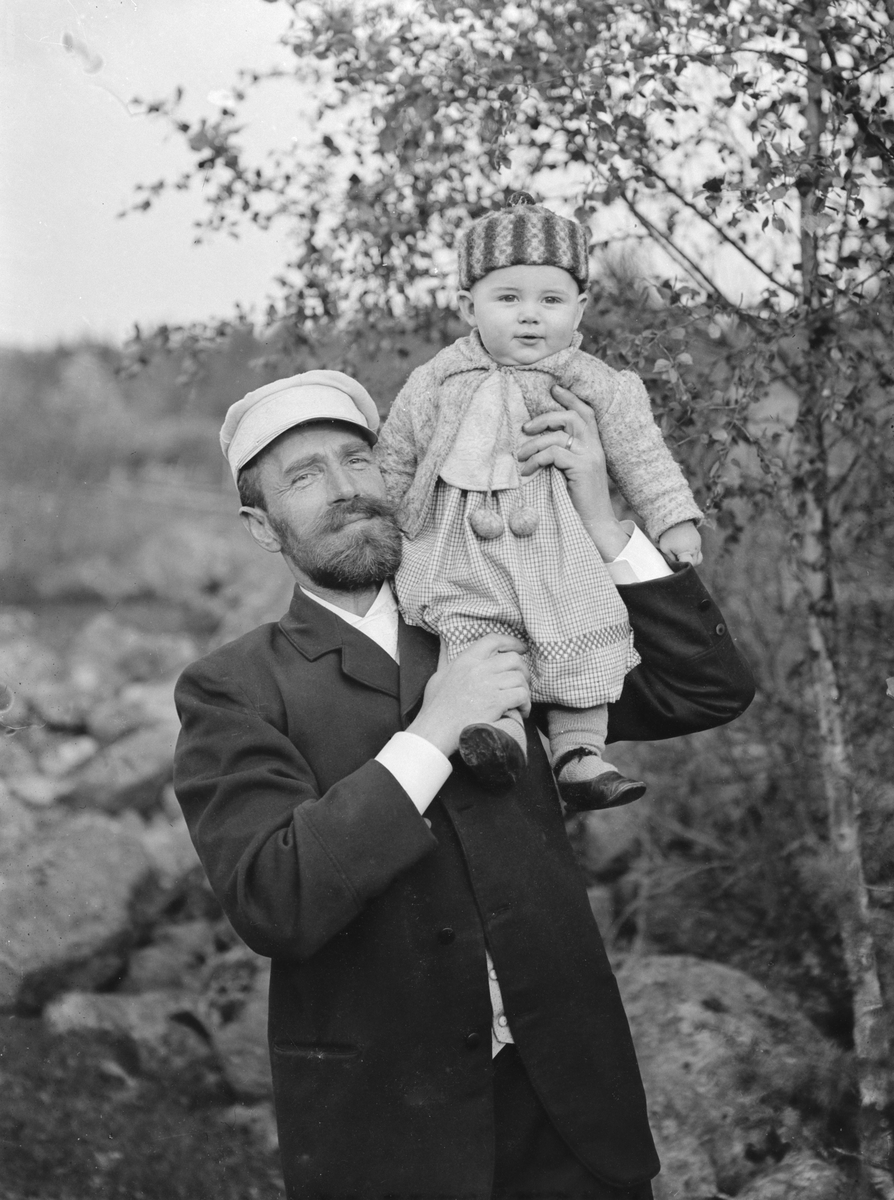 Komminister Carl Manneberg med yngste sonen Allan på sin axel. Familjen var bosatt i kaplanbostället Skuru under åren 1891-1915. Allan blev sedermera kriminalkonstapel i Stockholm. Året är 1891.