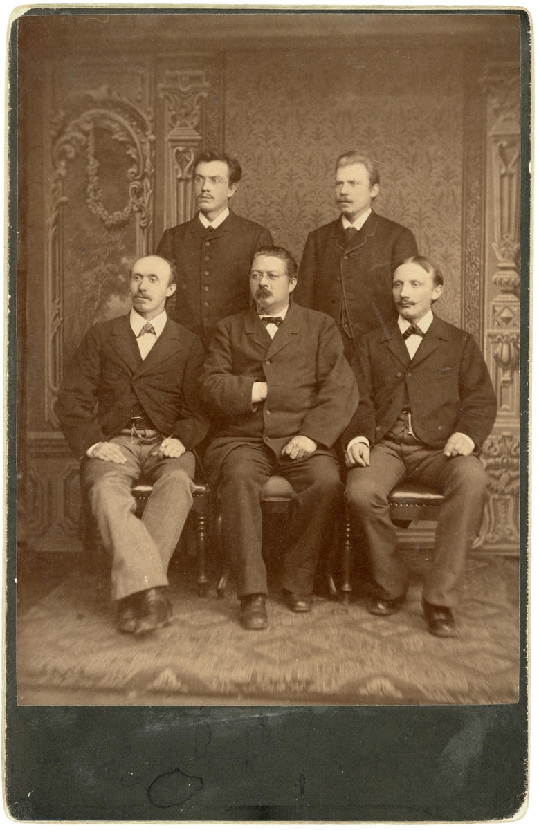 Fem herrar anställda vid Reijmyre glasbruk. Stående från vänster, Johan Vogel och Erik Schmidt. Sittande från vänster, Florian Vogel, Oscar Schmidt och Hagenbrandt. Männens identitet har inte kunnat styrkas.