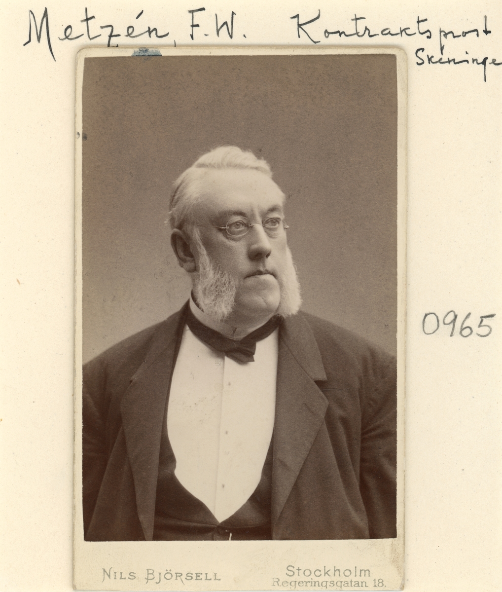Porträtt av Fredrik Wilhelm Metzén. Född i Linköping avlade han doktorsexamen i Uppsala 1863 och tjäntgjorde från samma år som adjunkt vid läroverket i Norrköping. Efter prästvigning 1866 i tjänst som kyrkoherde och vidare kontraktsprost i Skänninge. Även riksdagsman i Andra kammaren för Vadstena, Skänninge, Söderköping, Motala och Gränna. Från 1867 gift med Elvira Wavrinsky.