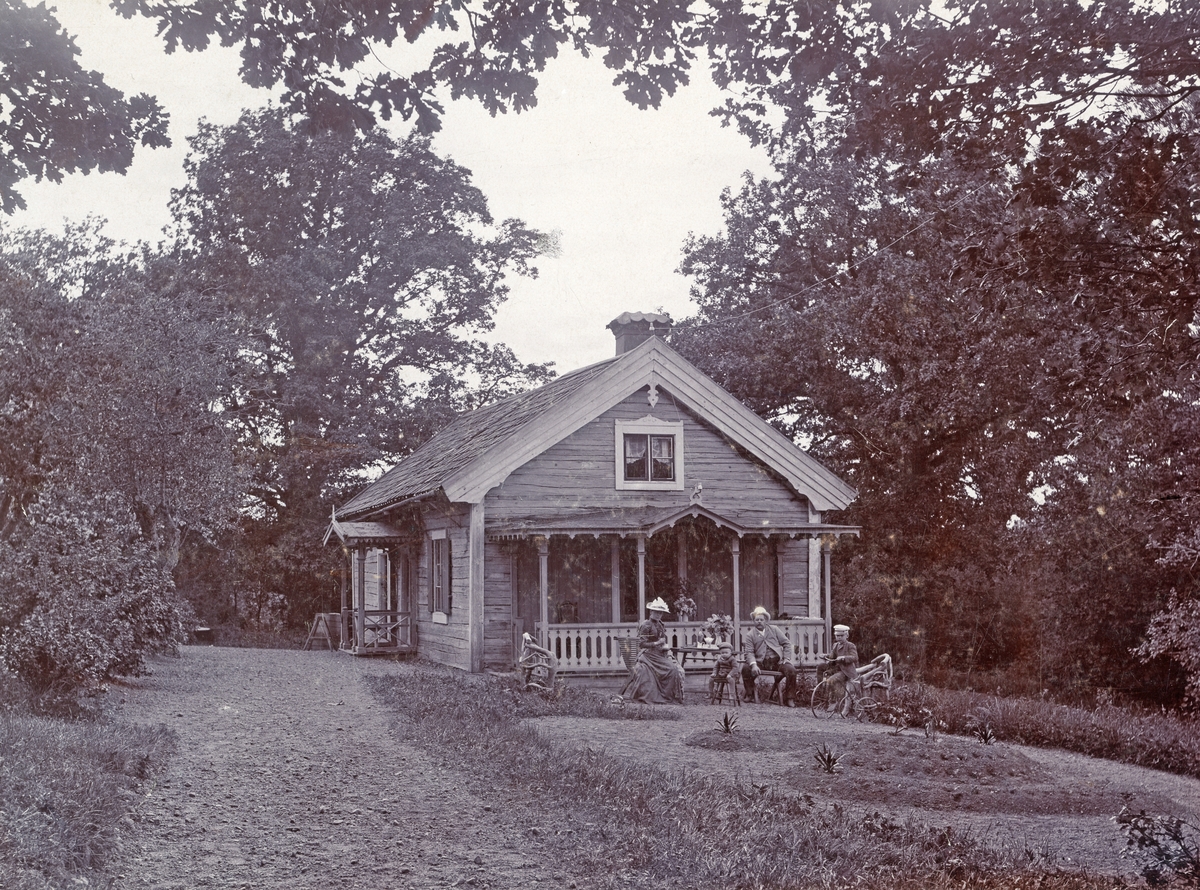 Familjen Karlsson utanför sitt sommarviste Drabbisdal strax norr om Linköping. Mellan makarna Axel Karlsson och Hedvig Düring sitter parets andra son Nils, född 1889. På cykeln till höger sitter äldste sonen Axel, född 1884. Axel Karlsson drev vid tiden för bilden sedan länge en framgångsrik manufakturrörelse i Linköping.