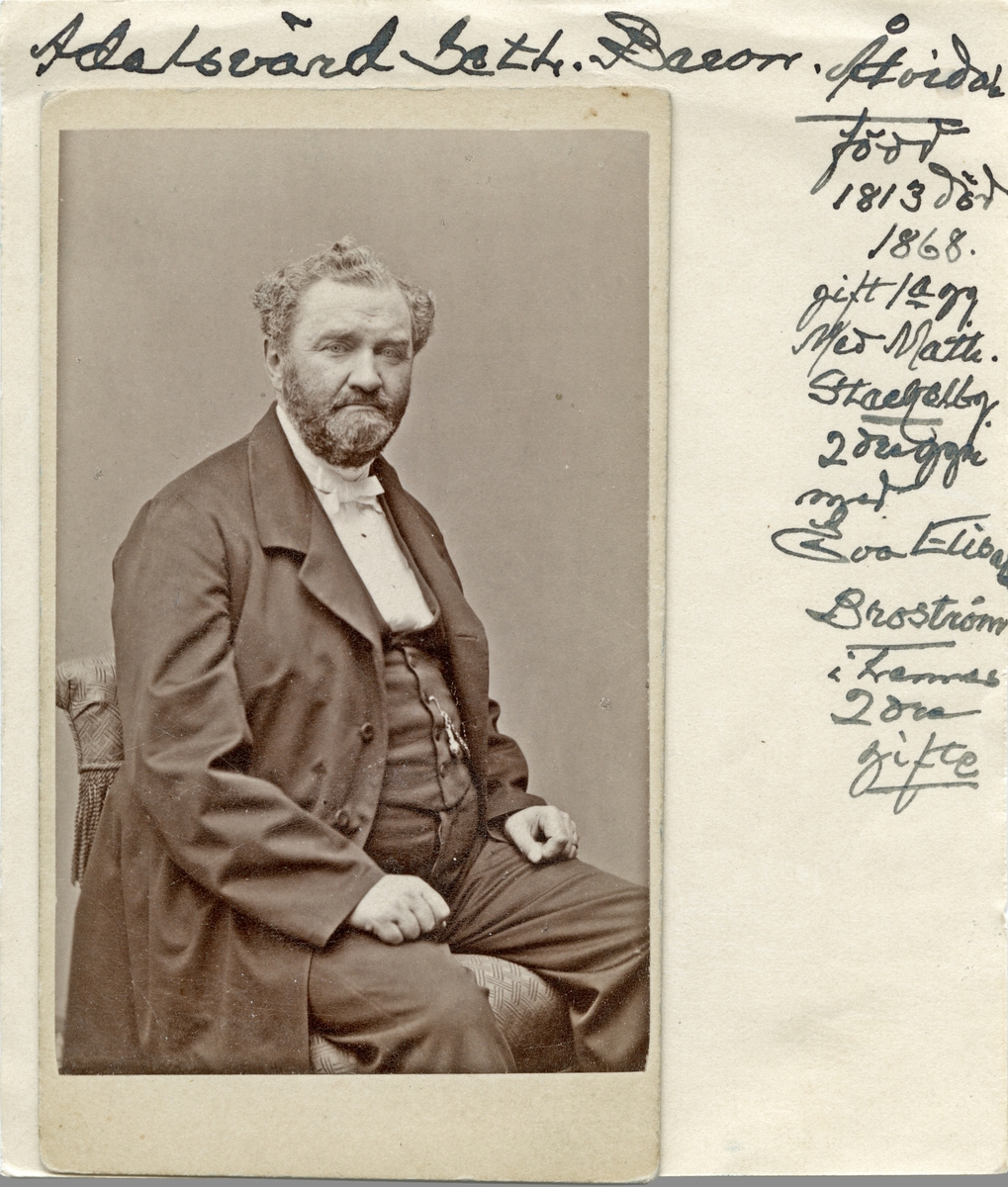 Porträtt av friherre Seth Adelswärd Adelswärd (1813-1868), Åtvidaberg. Gift första gången med grevinnan Matilda Carolina Lovisa Stackelberg. Gift andra gången med Eva Elisabet Broström.
