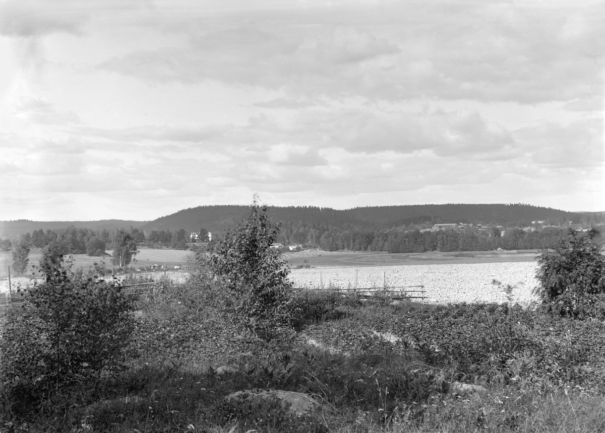 Motiv från Hannäs med vy mot Hägerstad slott vid sidan av godsets ladugård och trädgårdsmästarbostad. Invid Hägerstadviken till höger ses slottsägarnas badhus och ovan i bakgrunden sträcker sig byn Solvestad.