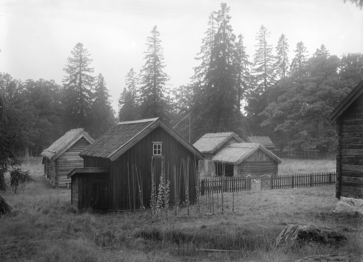 Motiv från Fornhemmet i Bjärka Säby. Även kallat Sandgården efter mangårdens ursprungliga läge. Friluftsmuseet kom till på 1920-talet på initiativ av godsägare Oscar Ekman. Byggnaderna har flyttats från godsets ägor och samlats i den vackra ekhagen intill Stångån. Arbetet leddes av den framstående folklivsforskaren Sigurd Erixon. I blickfånget ligger bod och drängstuga från Stora Tolemålen med sin humlegård.