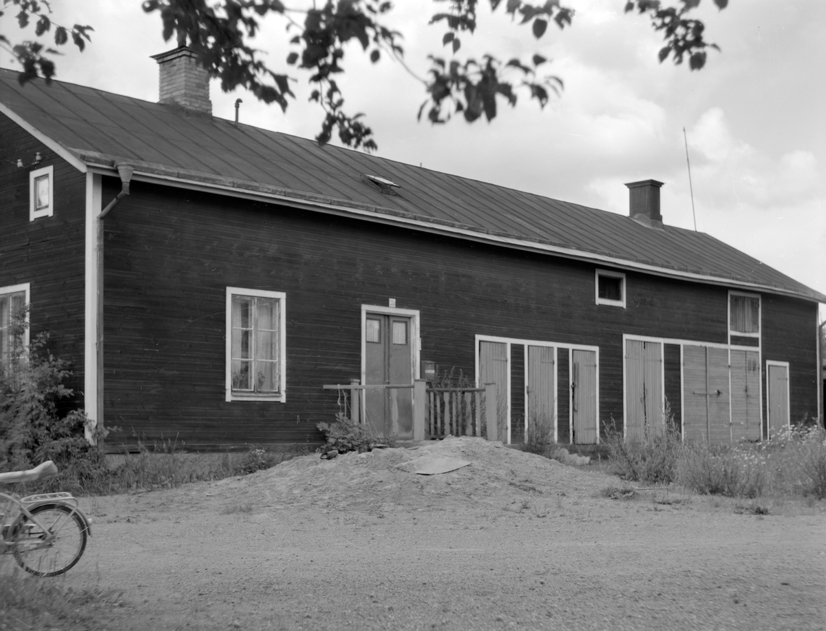 Bostad med sammanbyggd uthuslänga utmed Färgaregatan i Linköping. Här dokumenterad 1967 kort före rivning.