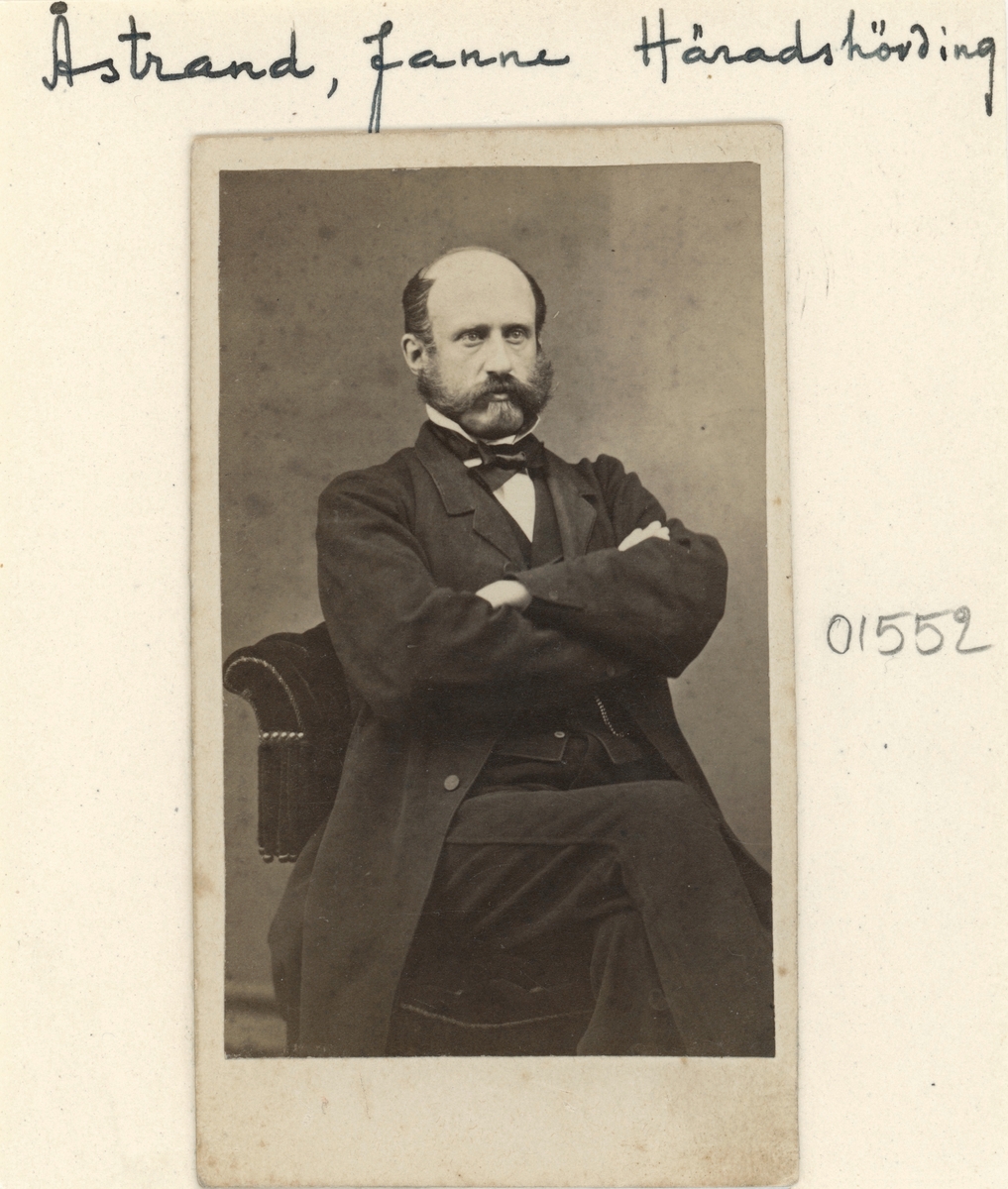 Enligt påskrift porträtt av häradshövding Janne Åstrand. Genom detta tolkat föreställa Johan "Janne" Åstrand. Född och uppvuxen på säteriet Ed i Ydre som son till överjägmästare Carl Johan Åstrand och hustrun Catharina Lilliehöök. Genom arv kom han i vuxen ålder i besittning av Graby säteri, likt Ed beläget i Sunds socken, Ydre. Från 1863 gift med Anna Mathilda Charlotta Hellström, född i Stockholm 1843.