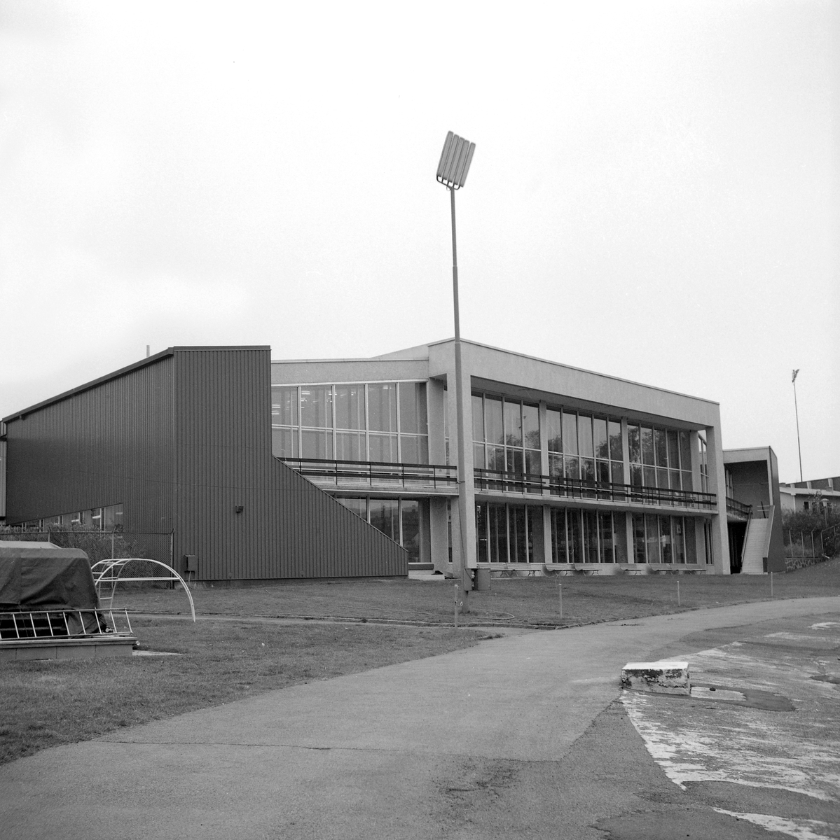 Linköpings simhall stod klar 1965, uppförd efter ritningar av arkitekt Hans Westman. Knappt tio år dessförinnan hade samme man ritat den intilliggande Sporthallen. Bilden visar simhallens fasad mot Tinnerbäcksbadet.