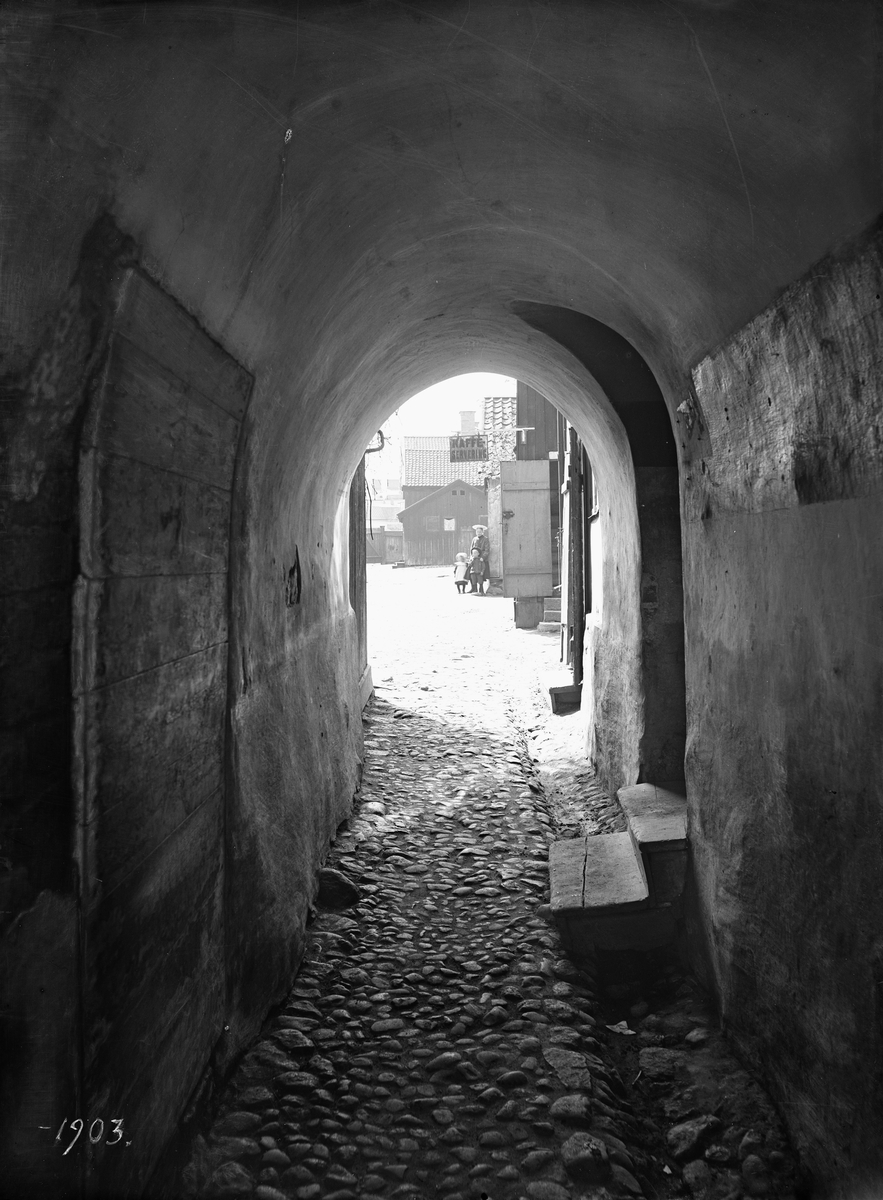 Inblick mot Westmanska gården vid Stora Torgets sydvästra del. Efter stadsbranden år 1700 avsåg man att förlänga Platensgatan genom gårdens bebyggelse. Dåvarande ägare Anders Lenström byggde emellertid över den tänkta gatusträckningen. År 1707 togs det visade valvet upp som en kompromiss mellan gårdsägaren och stadens myndigheter.